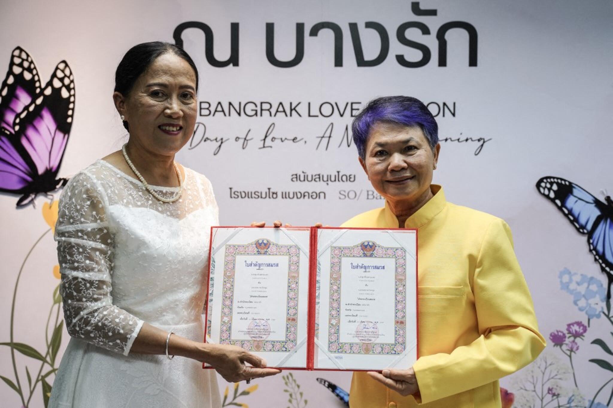 Les thailandais‧es attendaient depuis septembre l’application de la nouvelle légalisation, et ça s’est activé de tous les côtés pour organiser une giga-fête dans la ville. Pas étonnant, puisque certains attendaient ça depuis 20, 30, 40 ans… Dès le 23 janvier, près de 2000 couples LGBTQIA+ ont signé le papier de mariage le même jour à Bangkok, en costumes traditionnels ou pas, avec concerts et drags shows au rendez-vous. Sumalee Sudsaynet et Thanaphon Chokhongsung ont été les premières femmes à se dire « oui« , dans un arrondissement joyeusement nommé Bang Rak (« Rak » se traduit par « amour« ).