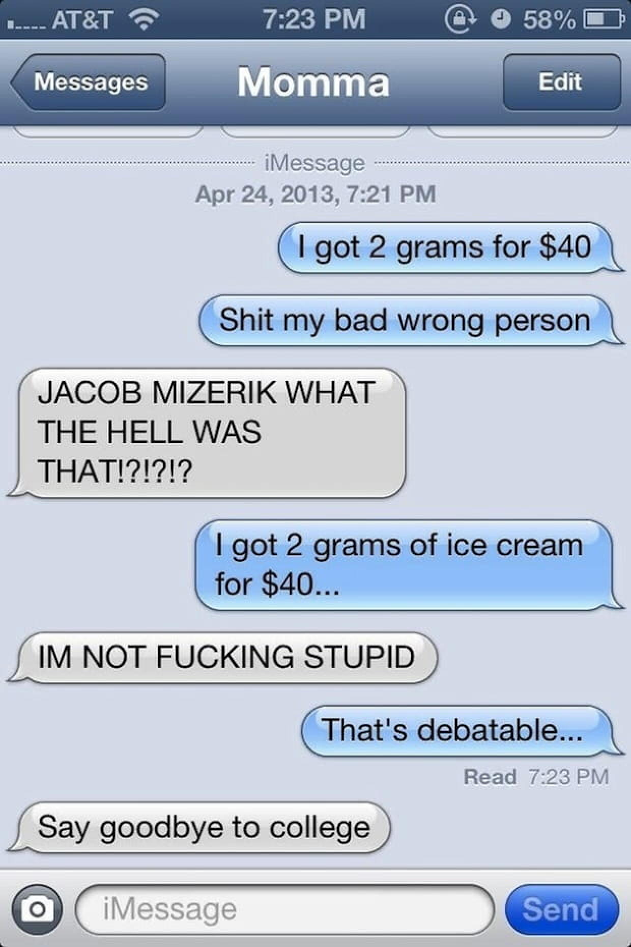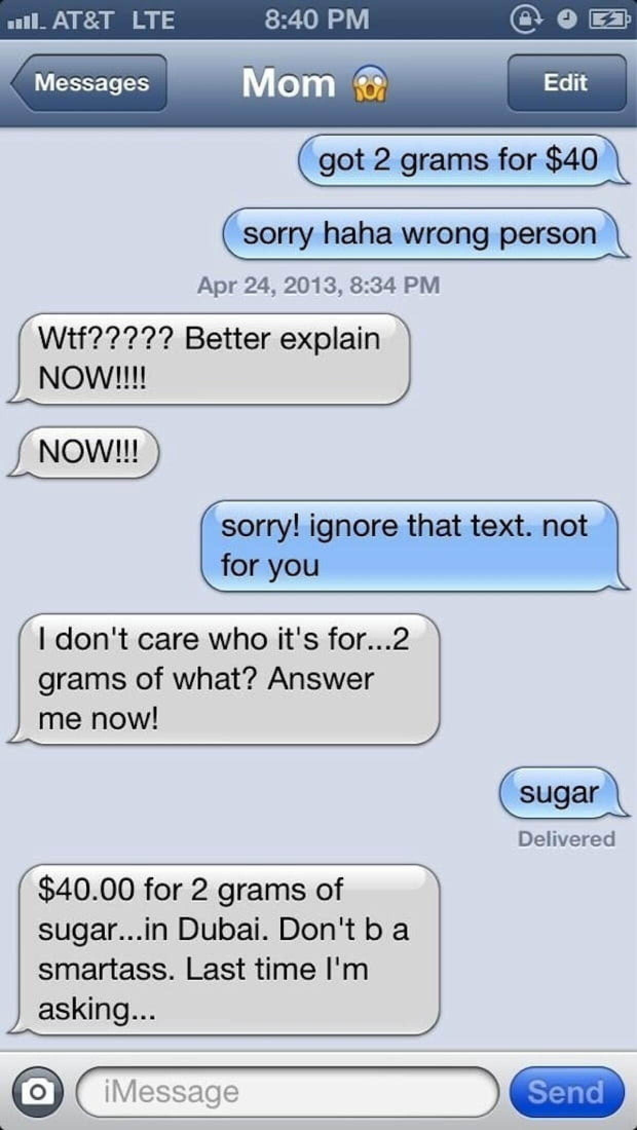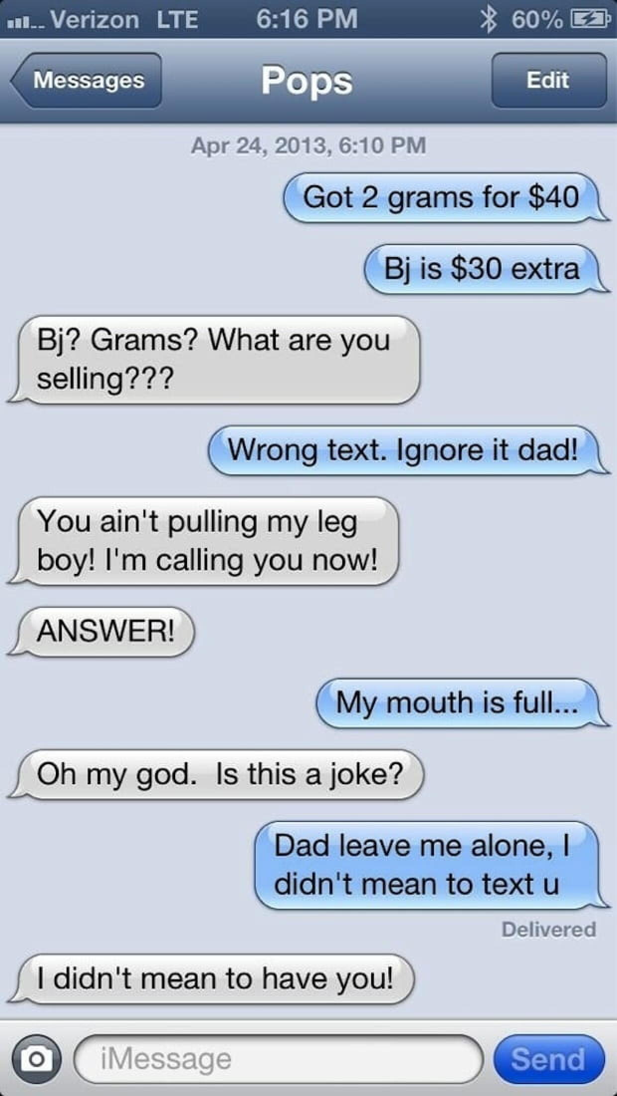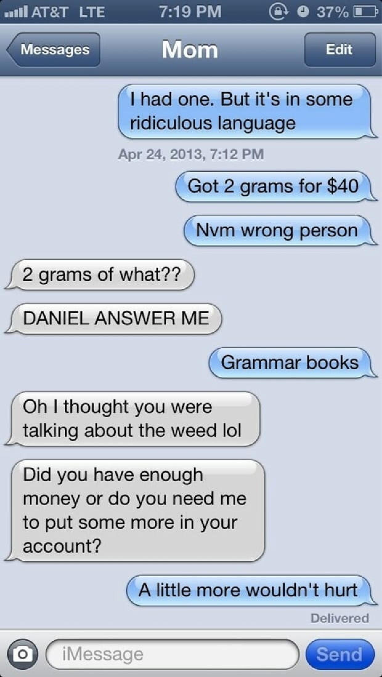 « Got 2 grams for $40 » (J’ai eu 2 grammes pour 40 dollars). Voila le texto qu’il suffit d’envoyer à ses géniteurs pour voir ce qu’ils pensent de vous.