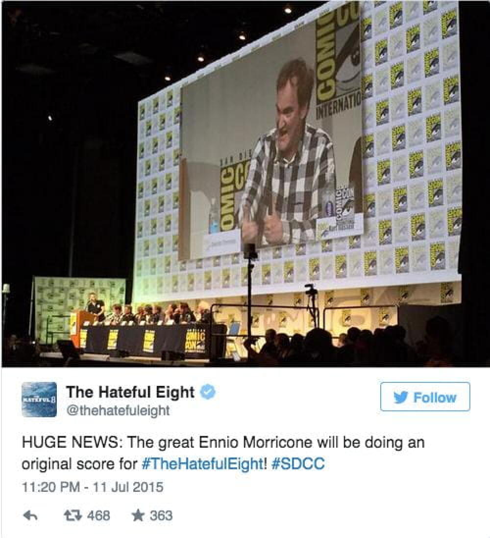 On les croyait brouillés, et pourtant, Tarantino et Ennio Morricone ont ressigné autour de The Hateful Eight le nouveau western du réalisateur. S’ils ont déjà travaillé ensemble et notamment sur Django Unchained – où le compositeur avait offert « Ancora Qui » un titre inédit – le grand Ennio avait annoncé ne plus vouloir s’associer au réalisateur qui (tout fan inconditionnel qu’il est) ne respectait pas suffisamment le travail de composition.