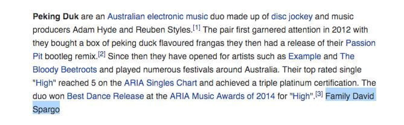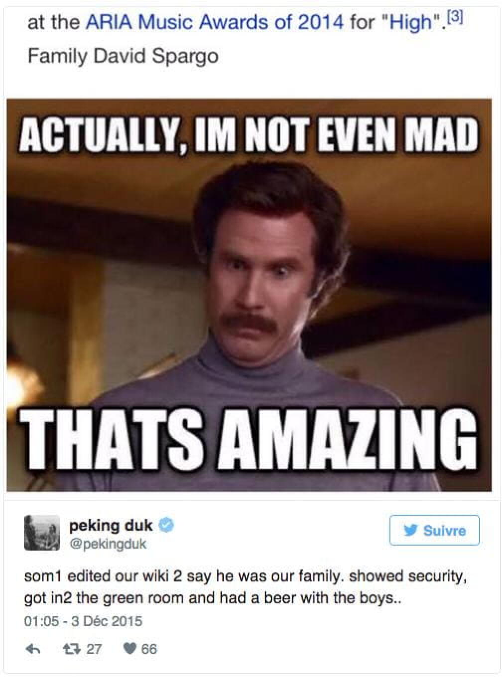 L’histoire est une anecdote parfaite, l’histoire d’un fan sacrément débrouillard. David Spargo est le nom du futé, fan de la musique de Peking Duk, qui par une subtile modification de la page Wikipédia du groupe est parvenu à convaincre un officier de sécurité qu’il faisait partie de la famille du groupe et s’est ainsi octroyé une entrée gratos, et même un accès aux loges pour partager une bière avec le groupe.