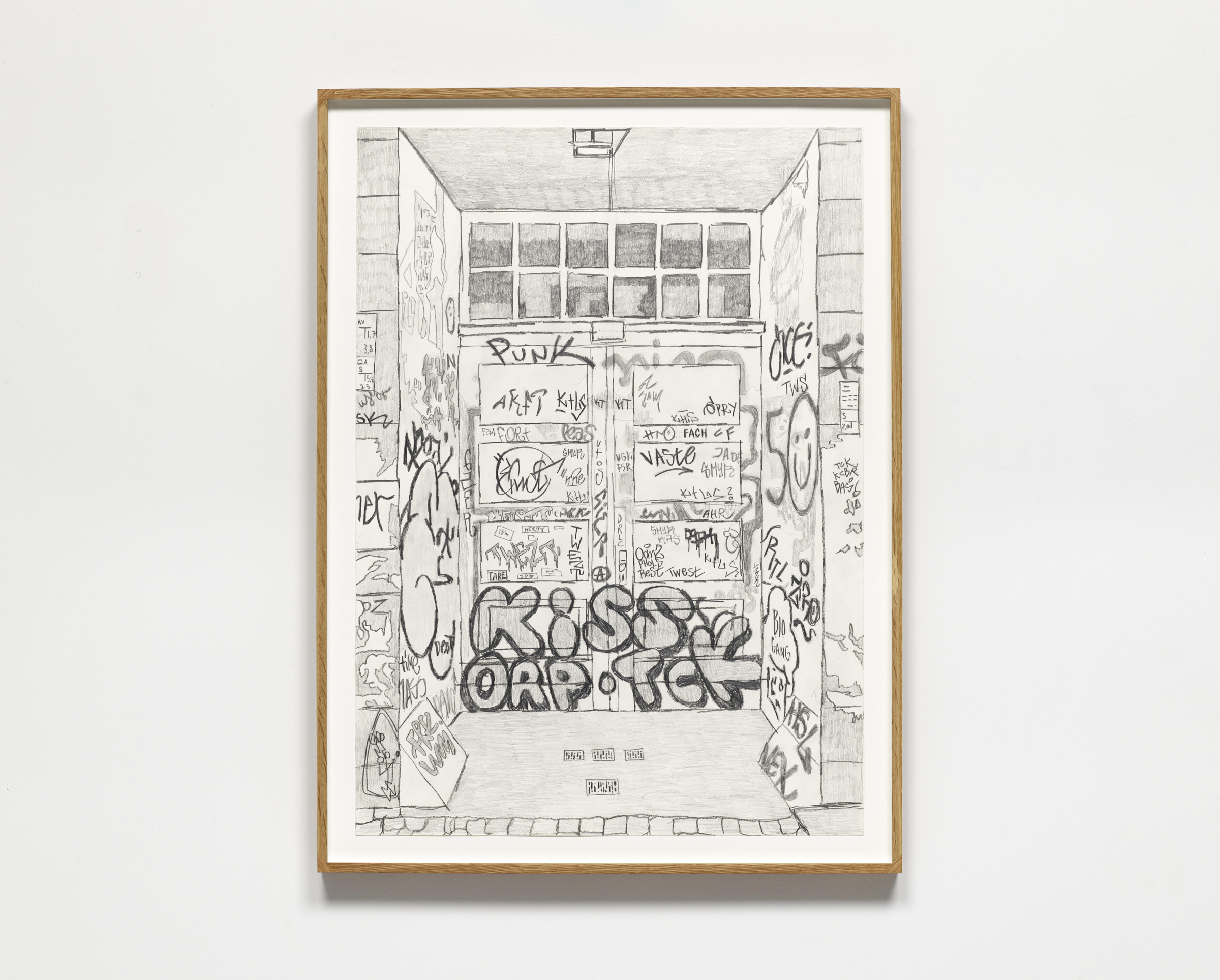 Pour amplifier la dimension collective de son travail, Christian Falsnaes expose une sélection de dessins de la série « Writers United Against The Grey » (2023). Il reprend au crayon graphite les graffitis berlinois, qui, pour lui, représentent à la fois une déclaration de soi par l’acte de signature et un effort collectif par l’accumulation d’œuvres dans un même espace urbain. Encore une fois, le « JE » devient « NOUS ».