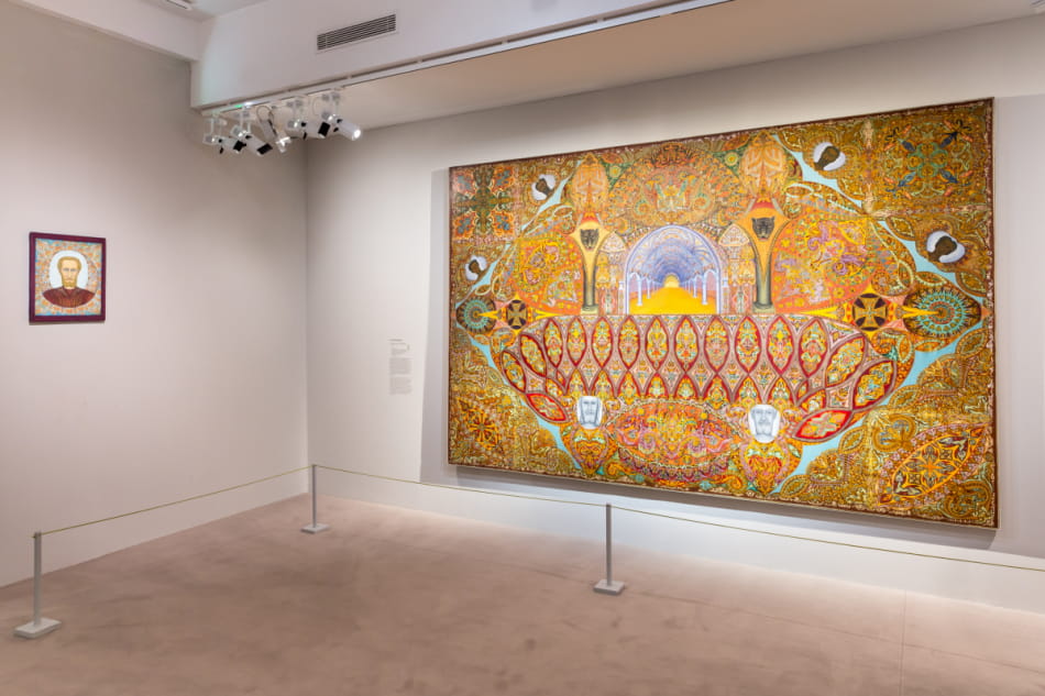 L’exposition « Esprit es-tu là ? » s’articule autour de trois grands peintres du XXème siècle, représentants de ce mouvement, tous les trois issus de milieux modestes sans prédispositions aux disciplines artistiques, qui déclarent avoir entendu des voix les ayant poussés vers la peinture. Victor Simon, Fleury-Joseph Crépin qui affirmera que cette voix lui indiquait : « Quand tu auras peint 300 tableaux, ce jour-là la guerre finira… » Il finira sa 300ᵉ toile le 7 mai 1945, la veille de la capitulation de l’Allemagne (peut-être devrait-on le remercier ?) Et finalement, Augustin Lesage qui signait certaines de ses toiles avec le nom de Léonard de Vinci ou encore de sa sœur Marie, morte à l’âge de 3 ans, convaincu que son art était une manifestation de leurs esprits à travers sa main.