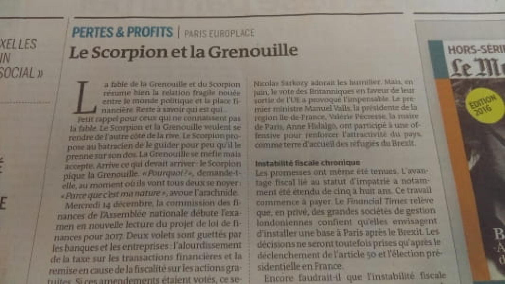 Dans l’édito qui ouvre les pages éco et entreprises du monde, Isabelle Chaperon cite la fable du scorpion et de la grenouille.