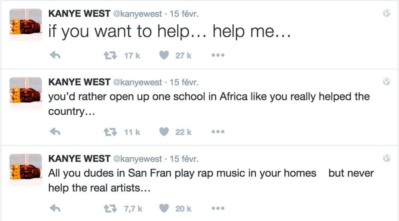 Kanye lance même un appel à l’aide, « si vous voulez aider Kanye, aidez-le… » poussant même quelques fans à créer des crowdfundings pour sauver leur idole. Avec un succès assez limité.