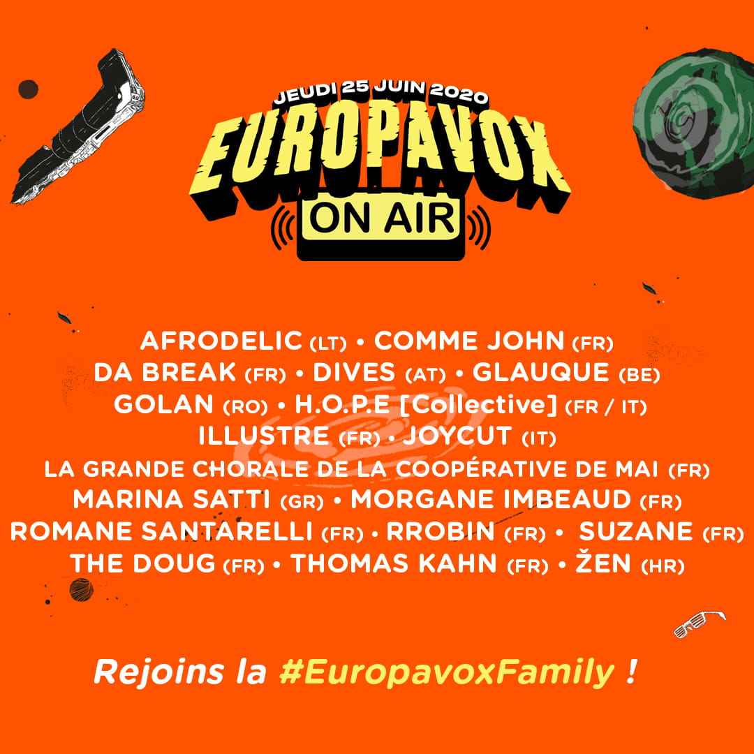 De 18h à minuit, pas moins de 20 groupes se produiront “On Air”, pour vous, chez vous. Entre scène européenne et scène régionale, mêlant interviews intimes menées par JD Beauvallet, illustre journaliste français, et concerts filmés dans des lieux inédits, l’intégralité d’Europavox vous sera dispo en quelques clics, sur les pages Facebook d’Europavox (festivals et média).