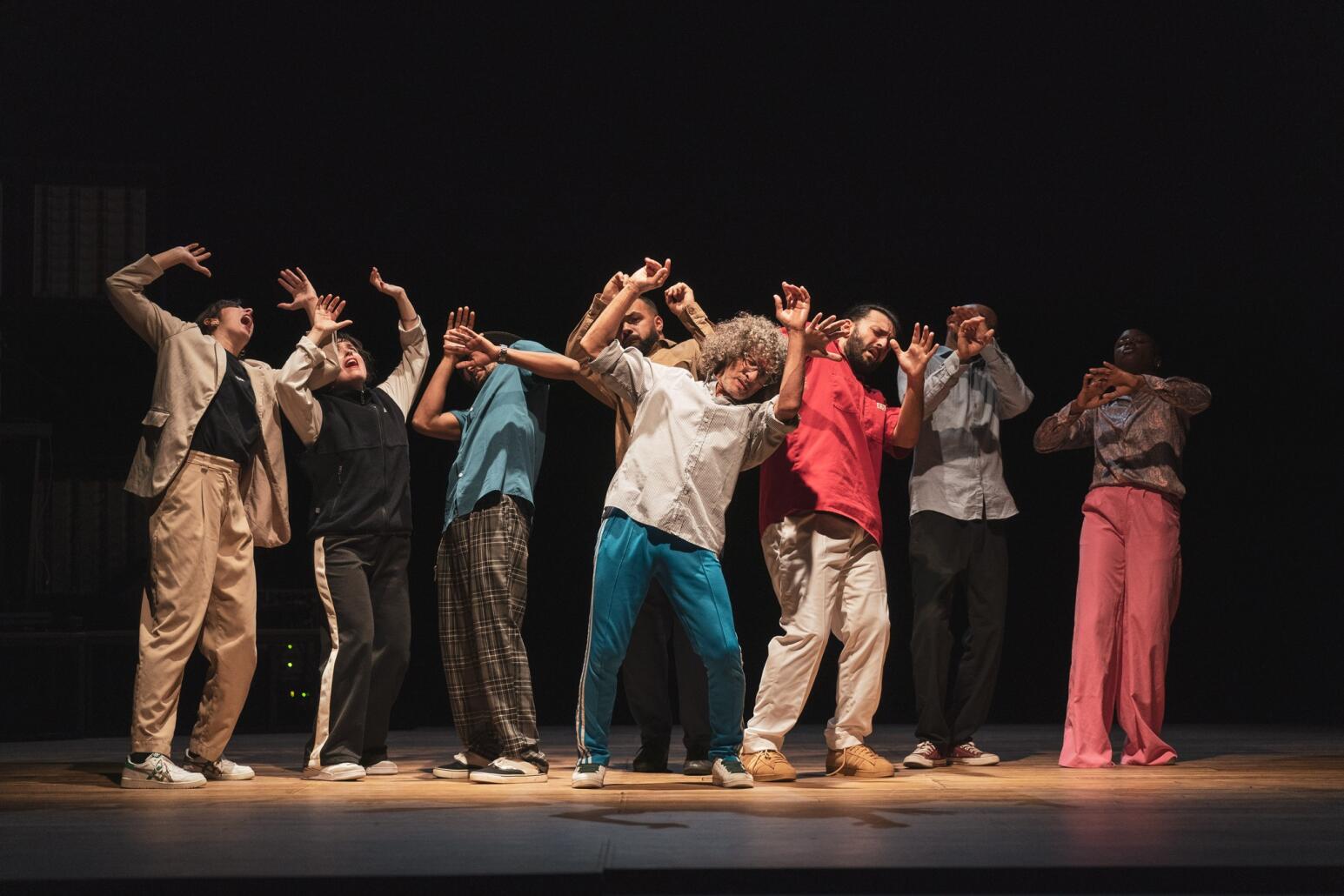Derrière cet intitulé simple et détonant, une pièce pour huit interprètes – vous voulez leurs blases, les voici : Tayeb Benamara, Aziz Ben Hemdane, Jimmy Duriès, Aymen Fikri, Juliette Lefauconnier, Iliass Mjouti, Dimitri Vandal et Oriana Zeoli – centrée autour du popping, cette « détonation atomique » chère aux battles hip-hop ; une technique de danse, aussi nommée electric boogaloo, qui trouve toujours une prise, sur un ondoyant tempo G-funk.