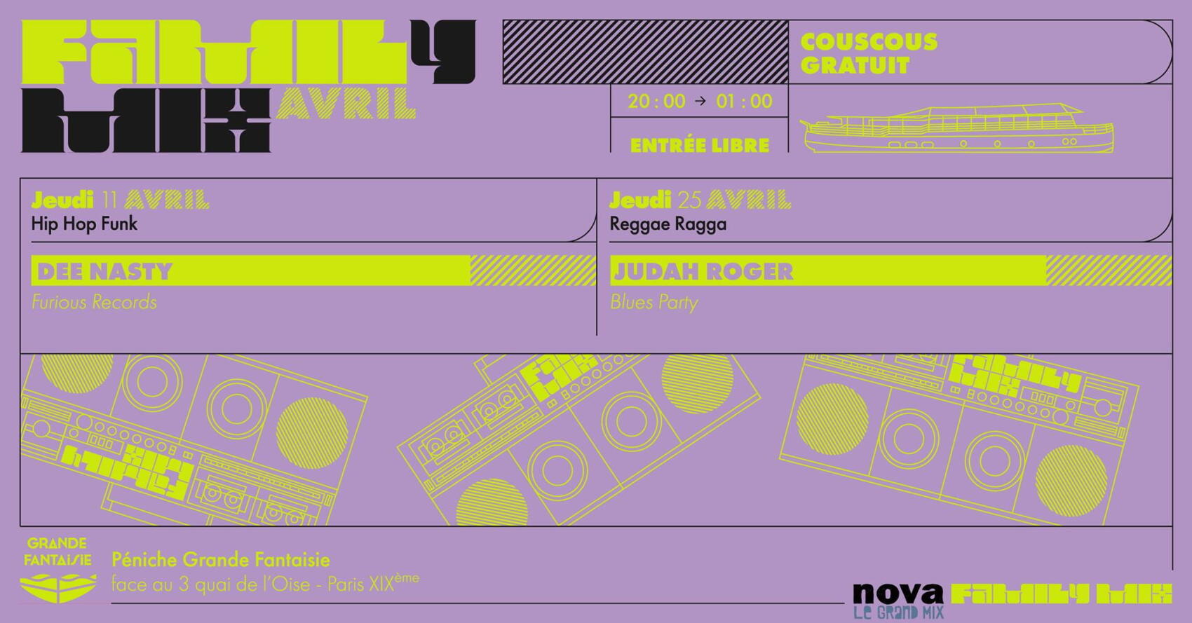 Family Mix | Dj Dee Nasty | Dee Furious Mix | les 11 et 25 avril à la Grande Fantaisie (face au 3, Quai de l’Oise, 75019 Paris) | Entrée libre | L’évènement ici.
