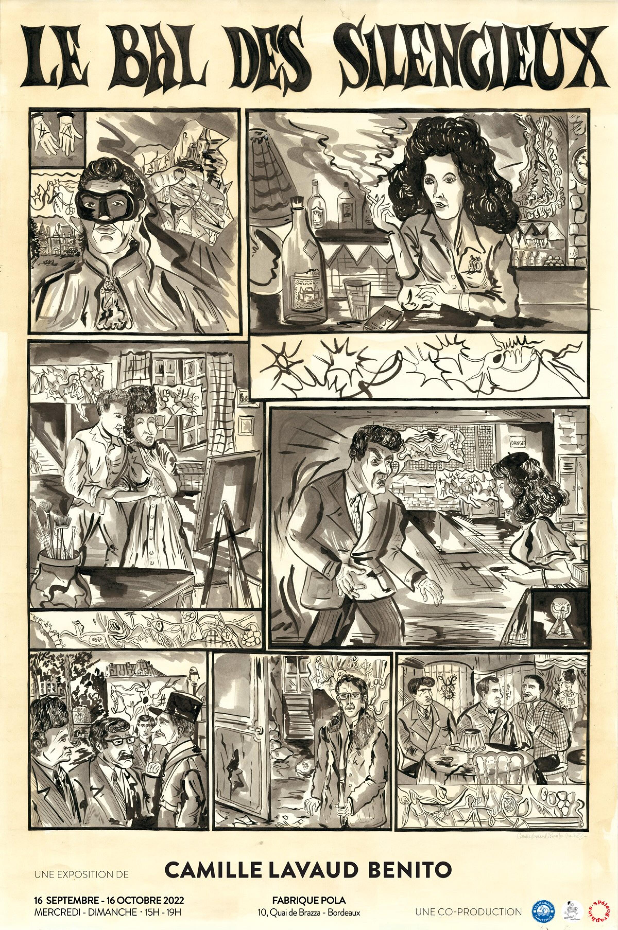 Mais n’en déplaise à tous ces illustres messieurs – Ané, Robial, Sornin … -, la star de ce Gribouillis, ce sera sans doute Camille Lavaud. L’autrice de cette aventure de l’underground – à plus d’un titre – qu’est La Vie Souterraine (lauré du Fauve Révélation au dernier Festival d’Angoulême), à qui l’on doit aussi quelques belles affiches pastichant les polars 50s et des pochettes de compilations Born Bad (Mobilisation Générale, Salvador, Évariste et les deux Vassiliu), sera coiffée d’une belle panoplie de casquettes. On la verra comme autrice, comme vedette d’une exposition intitulée Le Bal des Silencieux qui lèvera – à coups d’affiches, de décors, d’originaux, de bandes-annonces – quelques coins du voile sur son futur livre, suite à La Vie Souterraine. Mais aussi comme curatrice et présentatrice filmiques, en lever de rideau du Silence de la Mer de Jean-Pierre Melville, long-métrage de 1949 choisi par ses soins et projeté sur les écrans du Cinéma Utopia en séance spéciale.