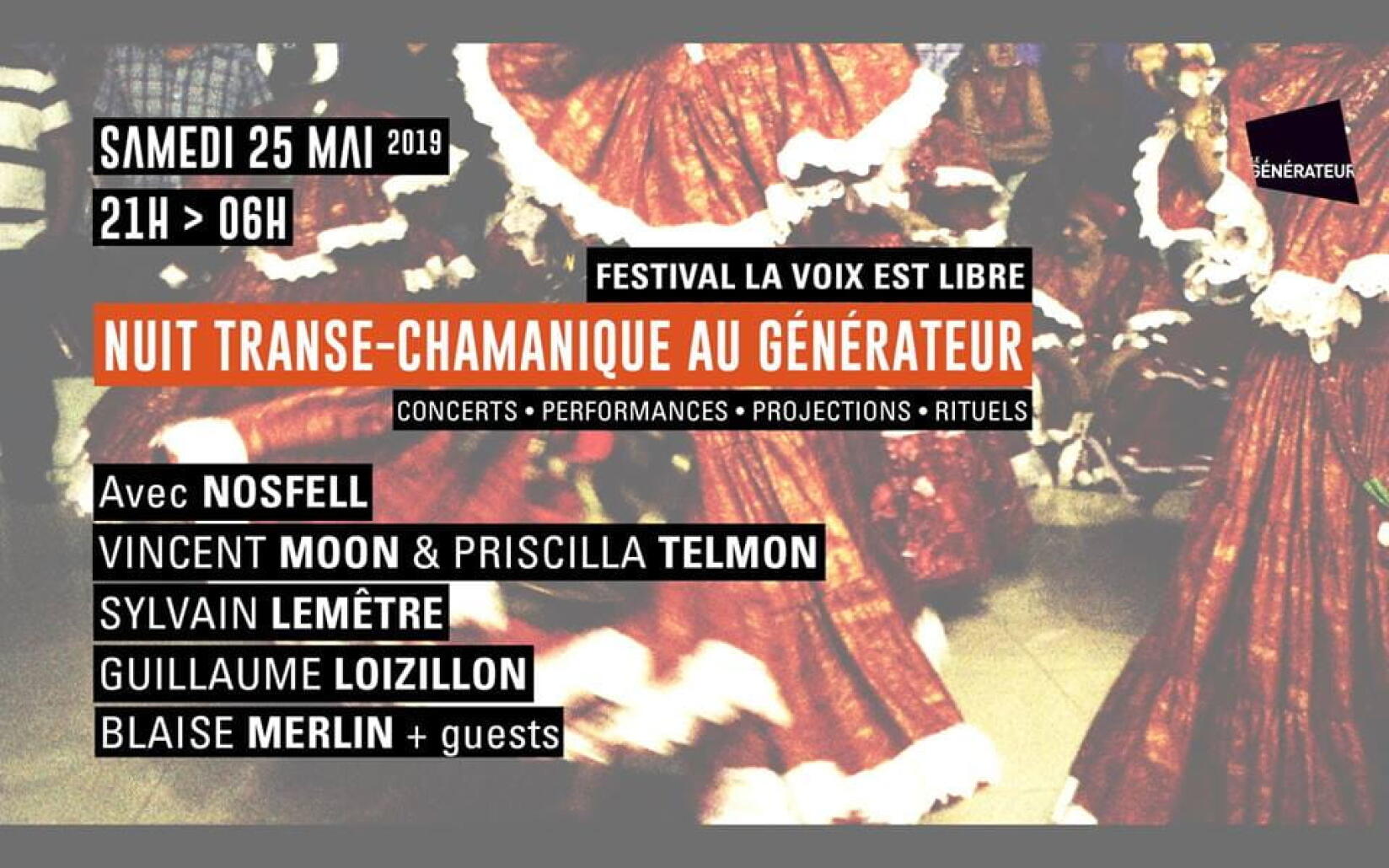 Festival La Voix Est Libre : “La nuit transe-chamanique” | le 25 mai de 21:00 à 06:00 au Générateur (16 rue Charles Frerot, 94250 Gentilly) | 12€-14€-16€ | Infos et billetterie ici | Evénement ici.