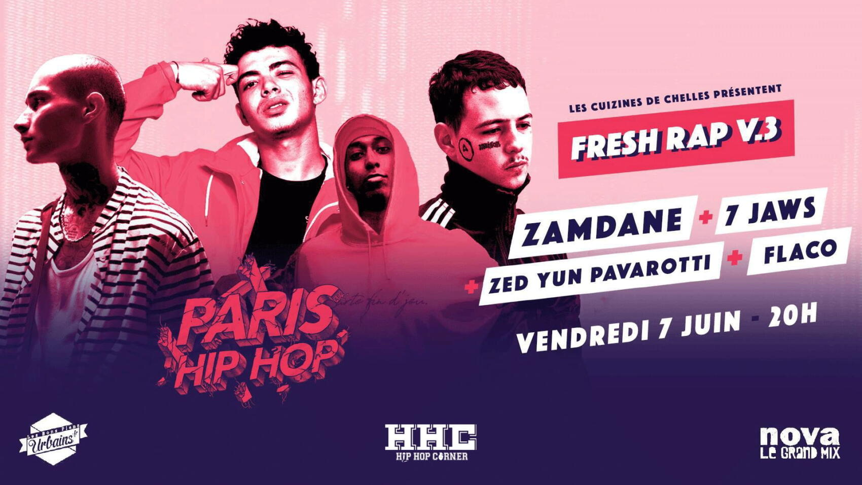 Fresh Rap : Zamdane + 7 Jaws + Zed Yun Pavarotti + Flaco | le 7 juin de 20:00 à 23:45 au Cuizines (38, rue de la Haute Borne, 77500 Chelles) | 10-12 € | Billetterie ici | Event fb ici.