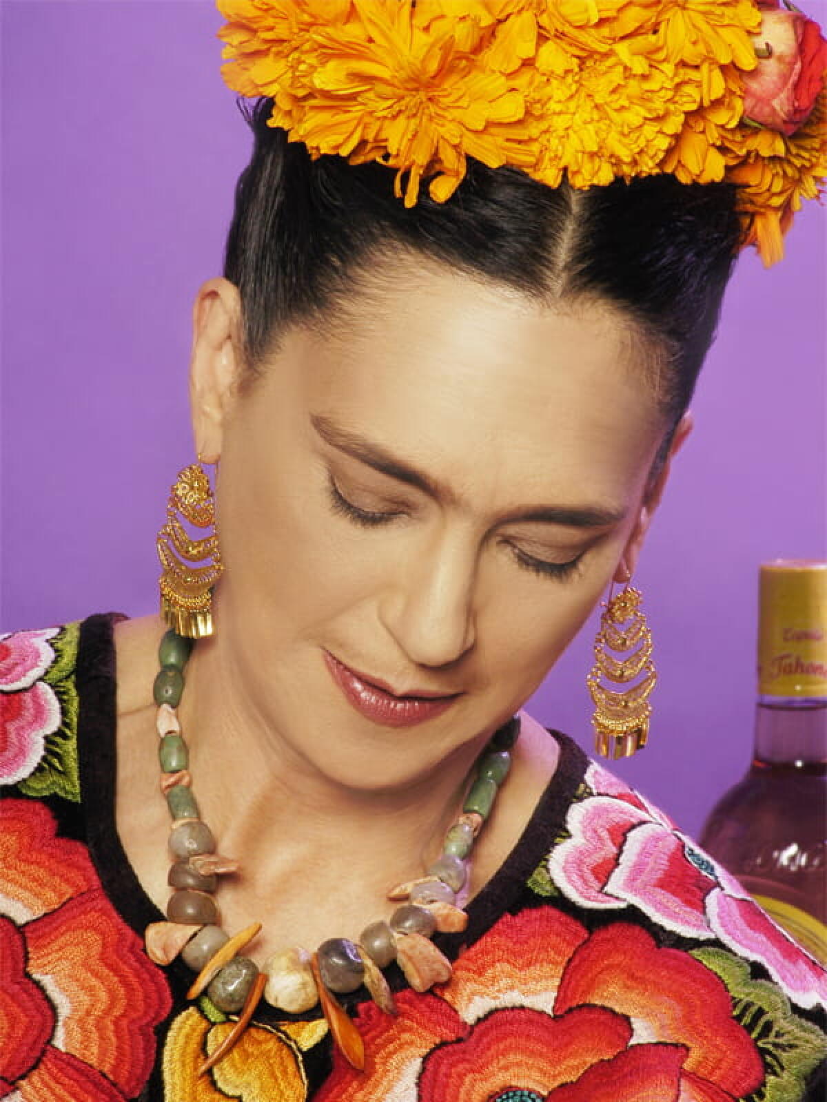 Rebelle, elle peint son ombre de moustache et accentue ses sourcils qui se rejoignent comme un V ouvert sur son front. Sa tête, auréolée de tresses de rubans et de fleurs, ses boucles d’oreille, bagues et bracelets sont exactement la tenue traditionnelle des Mexicaines de la capitale : les Indiennes.