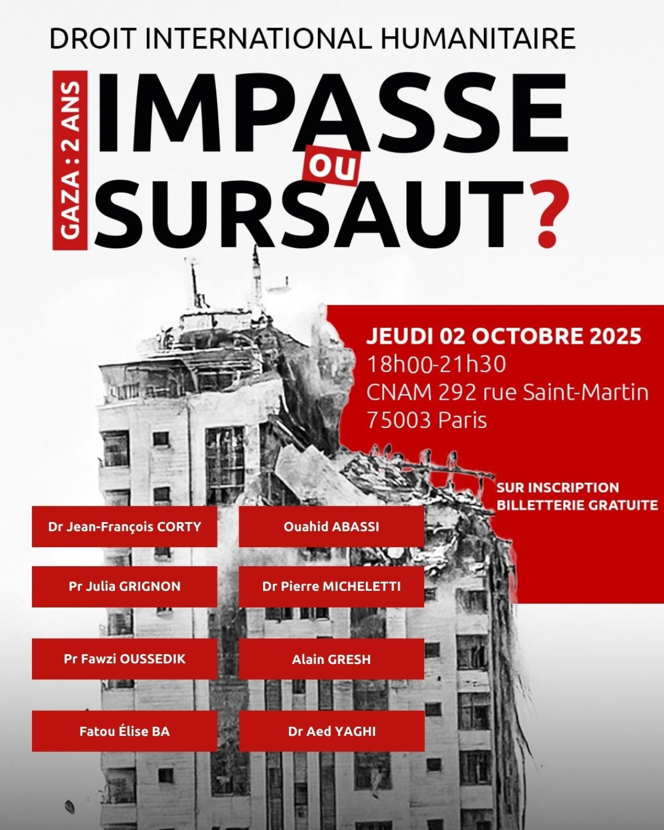 • Soirée-débat : Mercredi 2 octobre 2025, de 18h à 21h30, au Conservatoire National des Arts et Métiers (CNAM) à Paris, billeterie à retrouver ici : https://my.weezevent.com/2-ans-a-gaza-droit-international-humanitaire-impasse-ou-sursaut