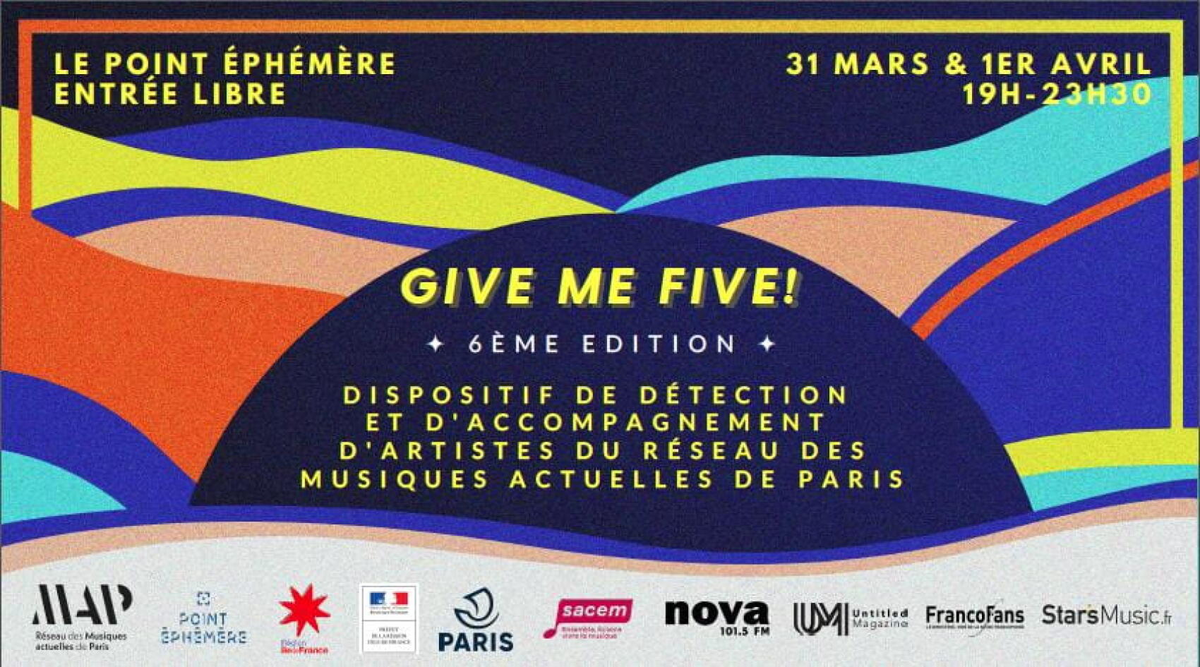 Depuis 2013, le Réseau Musiques Actuelles de Paris se donne pour mission de détecter et d’accompagner les talents parisiens de demain avec le projet Give Me Five!. Il permet à 5 groupes de bénéficier pendant un an d’un accompagnement sur mesure grâce à la contribution des adhérent·e·s du Réseau MAP et de ses partenaires, qui mettent à disposition des artistes leurs compétences et expériences. L’édition 2020 a été lancée fin octobre avec un appel à candidatures qui a rapidement laissé place à la période de vote sur écoute durant laquelle les adhérent·e·s ont un mois pour découvrir les projets candidats. Nous voilà maintenant arrivé au stade crucial de la finale !