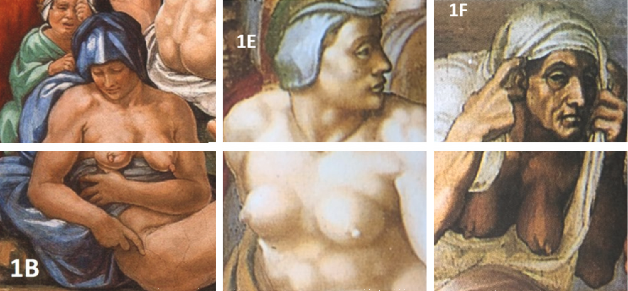 C’est la première fois que la femme au vêtement bleu est étudiée avec autant de précisions. Selon les historiens, la couleur bleue du tissu dans lequel elle est drapée désigne un statut de femme mariée et le doigt qu’elle pointe vers la terre fait référence à un retour imminent à la poussière. Mais ce qui a interpellé le plus les chercheurs, c’est que la poitrine de cette femme présente, ou présenterait, des caractéristiques physiques inhabituelles dans l’œuvre de Michel-Ange, qui savait très bien peindre les seins. Ces particularités ne seraient rien d’autre que celles d’un cancer du sein dans un état avancé.