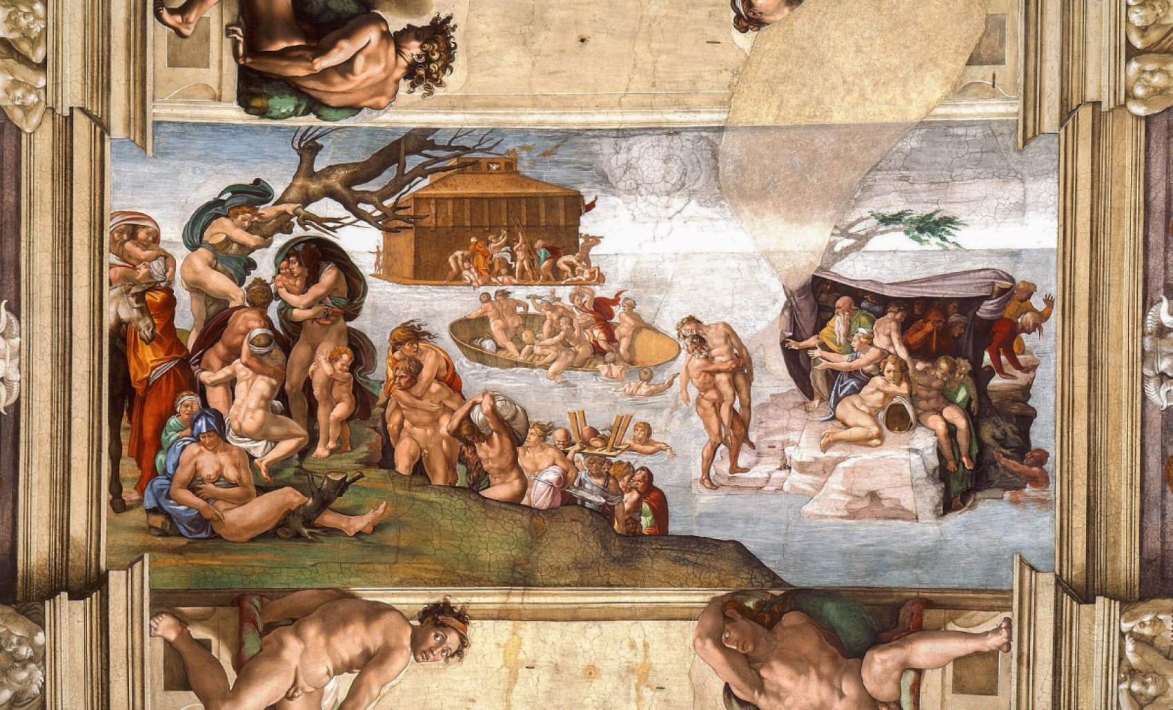 Au XVIᵉ siècle, Michel-Ange signe la fresque du plafond de la chapelle Sixtine, chef-d’œuvre absolu de la Renaissance italienne et réalisation artistique majeure de l’art occidental. Gigantesque, la peinture murale mesure 500 mètres carrés et présente une décoration complexe dans laquelle évoluent 350 personnages ou figures, dont une femme aux seins nus, dans la scène biblique du Déluge.
