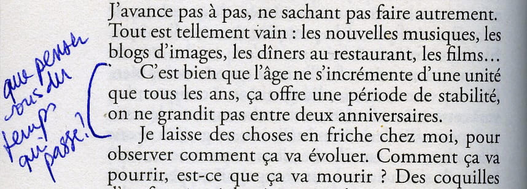 De mon côté, j’ai souvent franchement la sensation que tout se déroule en même temps, toute la vie. Le vieillard et le nourrisson, les grands événements, les petits, chaque choix, chaque plaisir, chaque vide…