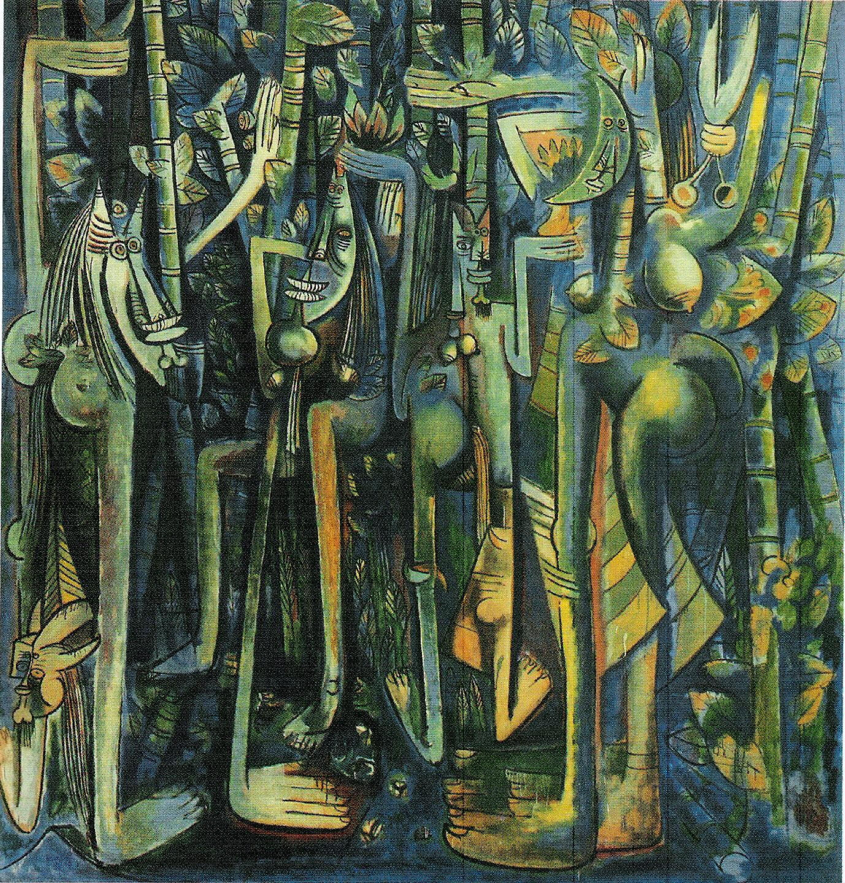 Météore unique, Wifredo Lam va trouver un langage pictural , dont il est le seul représentant : bambous, lianes, troncs, feuilles, pattes d’oiseaux et membres d’humains en rangs serrés .. Un fouillis évoquant la jungle, l’Afrique, les caraïbes …