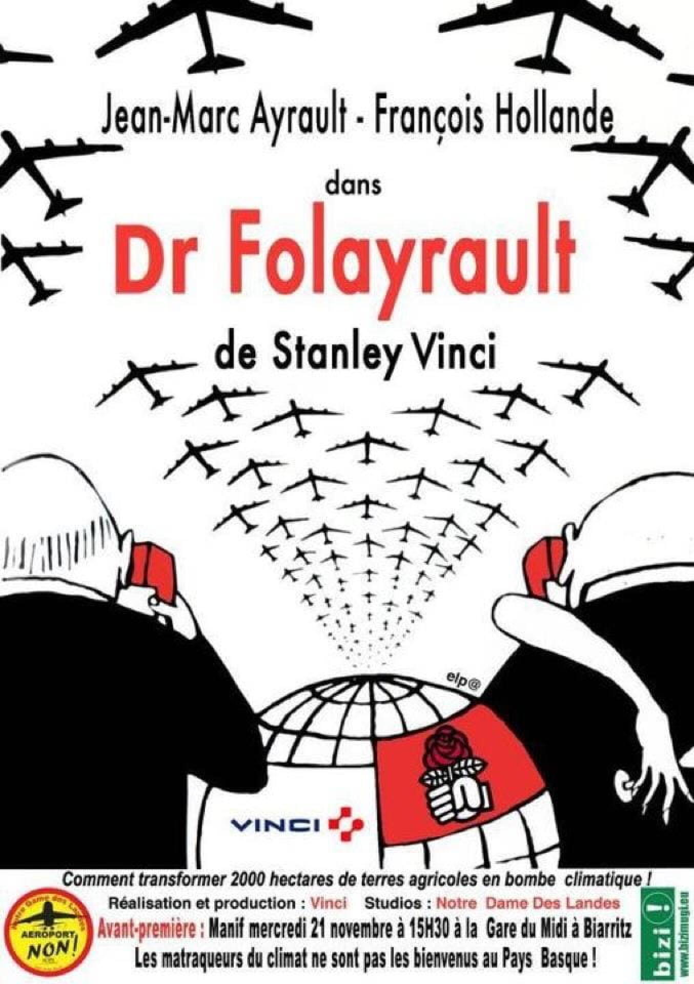On peut retrouver rassemblées sur une page Facebook toutes ces « Créations originales contre l’aéroport à Notre-Dame-des-Landes ». Par exemple une Google Map de France saturée d’avions, ou une parodie de l’affiche du Dr Folamour, « Dr. Folayrault de Stanley Vinci » – référence à l’ancien maire de Nantes aujourd’hui premier ministre et à la société chargée des travaux.