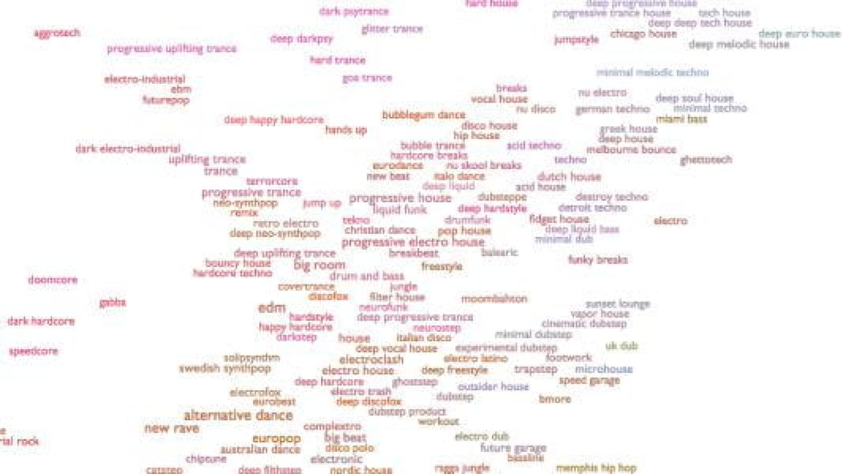 Internet, parfois, c’est vraiment bien. Et grâce à un auditeur (merci !) nous avons découvert un site qui fonctionne comme une cartographie musicale, répertoriant les milliers de styles qui ont fait l’histoire de la musique, et l’on comprend les proximités entre les genres, on peut tendre une oreille sur des mouvements parfaitement confidentiels, bref on peut passer des heures à écouter et fouiller dans cette encyclopédie unique en son genre, fondée sur un algorithme qui classifie quelques 1384 types de musique selon les principes suivants :