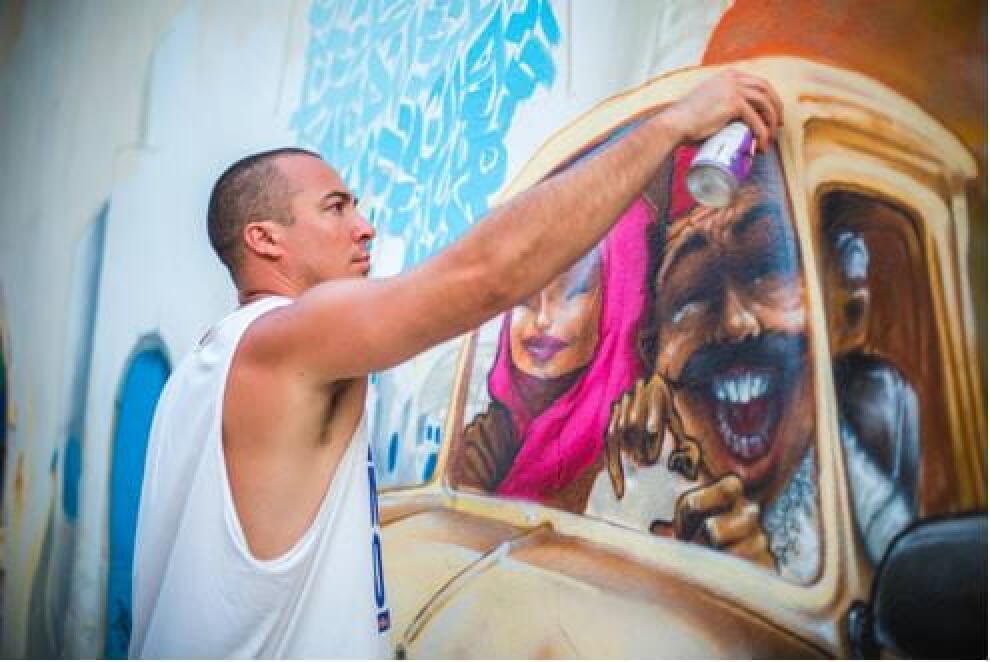 Quand l’art devient un facteur de paix et de tolérance. C’est le pari gagné de Mehdi Ben Cheikh de la galerie Itinérance. Après la tour Paris 13 c’est sur l’ile de Djerba en Tunisie dans le village d’Erriadh plus précisément que l’événement DJERBAHOOD a eu lieu les 18 et 19 septembre 2014. J’ai rencontré un personnage incontournable de l’ile en la personne de monsieur René, enfant du pays et footballeur dans sa jeunesse ainsi que deux artistes parmi la centaine d’intervenants, il s’agit de Dabro et Nilko. Le premier peint des apparitions et compte sur l’effet du temps pour renforcer son propos et le second vient de la bande dessinée qu’il a vite abandonné pour s’exprimer librement sur les murs, son kif ? Les personnages !