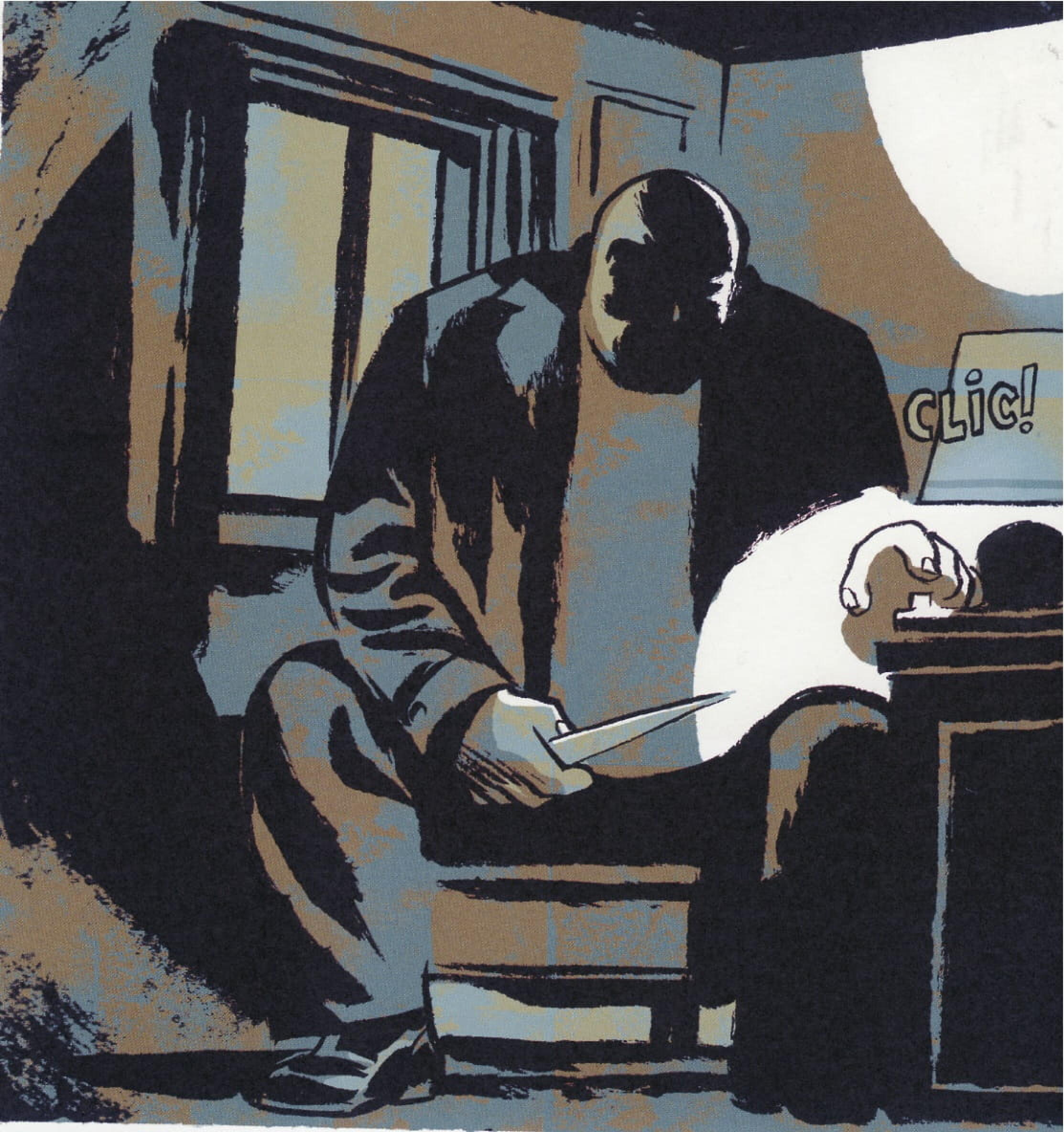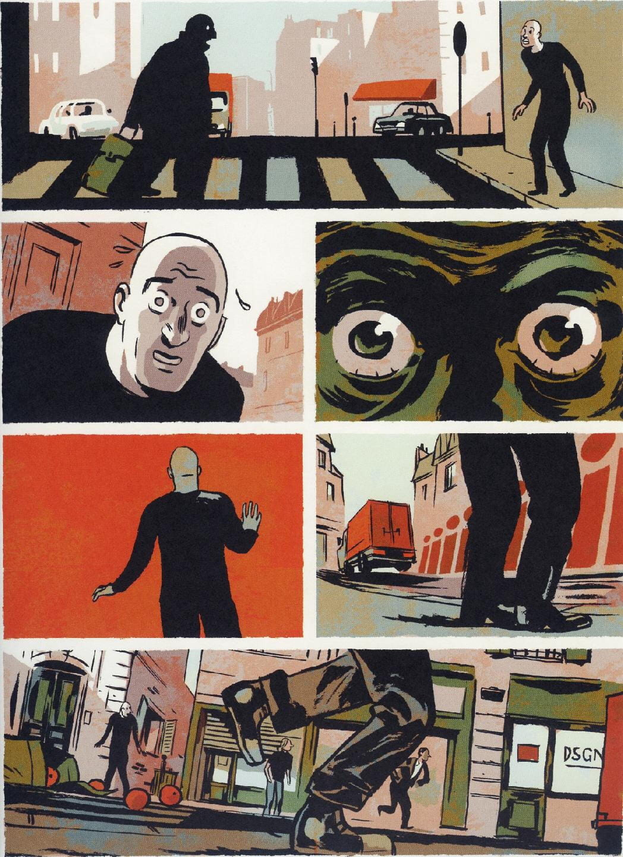 On pense à des sérigraphies, à Braque ou Matisse version BD, et quand l’histoire inquiète, les couleurs rassurent, des séries de Kaki et de bruns clairs… Bref, raffiné et tout, aucun abus de caricature ou d’expression, du dessin réaliste, simple et économe, un peu comme Hergé mais en moins classique .