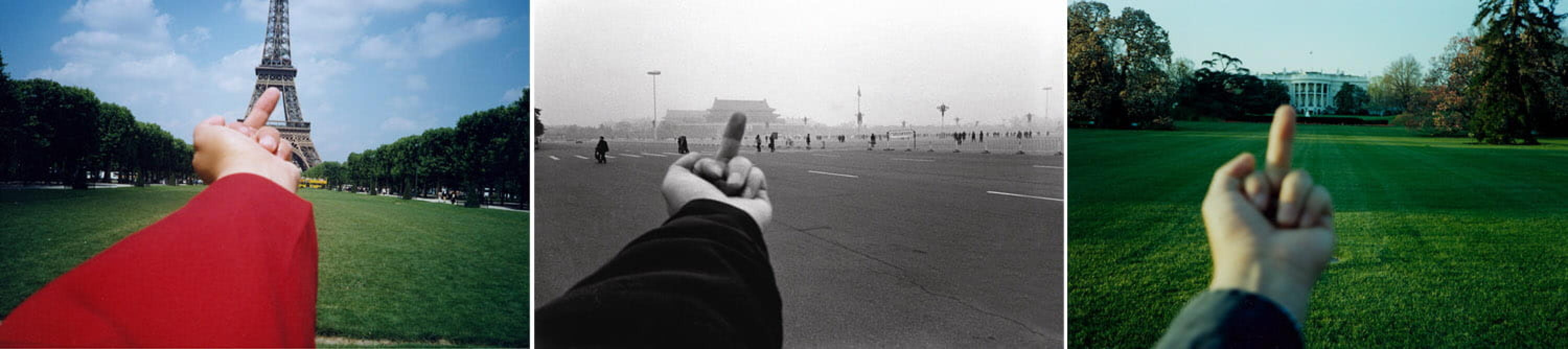 L‘an dernier, la galerie du Jeu de Paume exposait les photos d’Ai Weiwei dans « Entrelacs ». Entre autres œuvres, la photographie d’une jeune fille dévoilant sa petite culotte sur la place Tian’anmen (1994) jouxtait la série de doigts d’honneurs rapportée des quatre coins du monde. Le fameux bras brandi d’Ai Weiwei a ainsi été immortalisé sur la place San Marco à Venise (encore), devant la Tour Eiffel, la Maison Blanche ou le Colisée.
