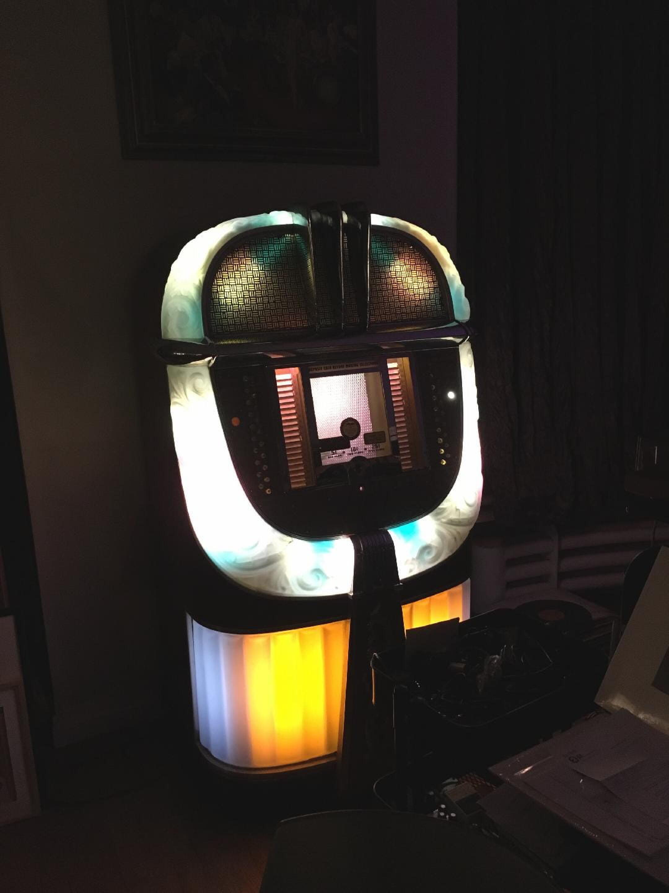 Tout est là : le vaisseau avec les machines pour piloter les sons, le piano, les jukebox, le flipper, les tableaux, le bar, des photos, des mots bleus, c’est Noël Boulevard du Montparnasse. À la dérive avec Christophe, c’est beau, c’est bizarre.