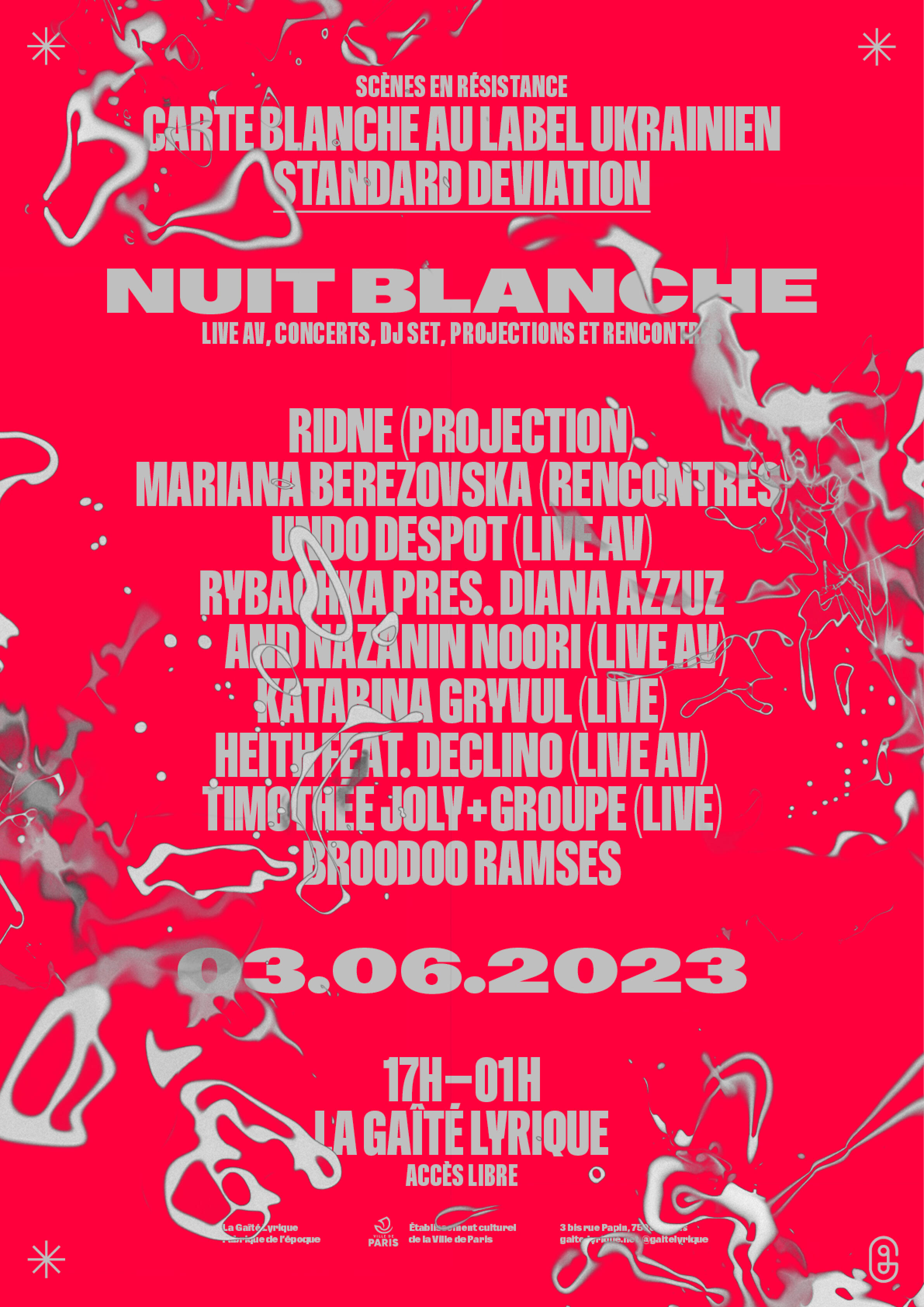 Cet événement qui invite des représentant·es de la scène ukrainienne pour des DJ sets, performances lives et projections devait initialement marquer la réouverture de la Gaité, avant d’être déplacé à la date de la Nuit Blanche. S’il n’est pas le coup d’envoi de ce nouveau chapitre, il marque cependant le début d’un nouveau cycle dans les murs “L’idée, c’est que cette soirée soit un point de départ pour nous d’une programmation plus vaste de “scènes en résistance” qui pourrait nous amener à aller du côté de la Syrie, de l’Afghanistan, […] et de documenter ces grandes causes et ces grandes luttes, à travers la création.”