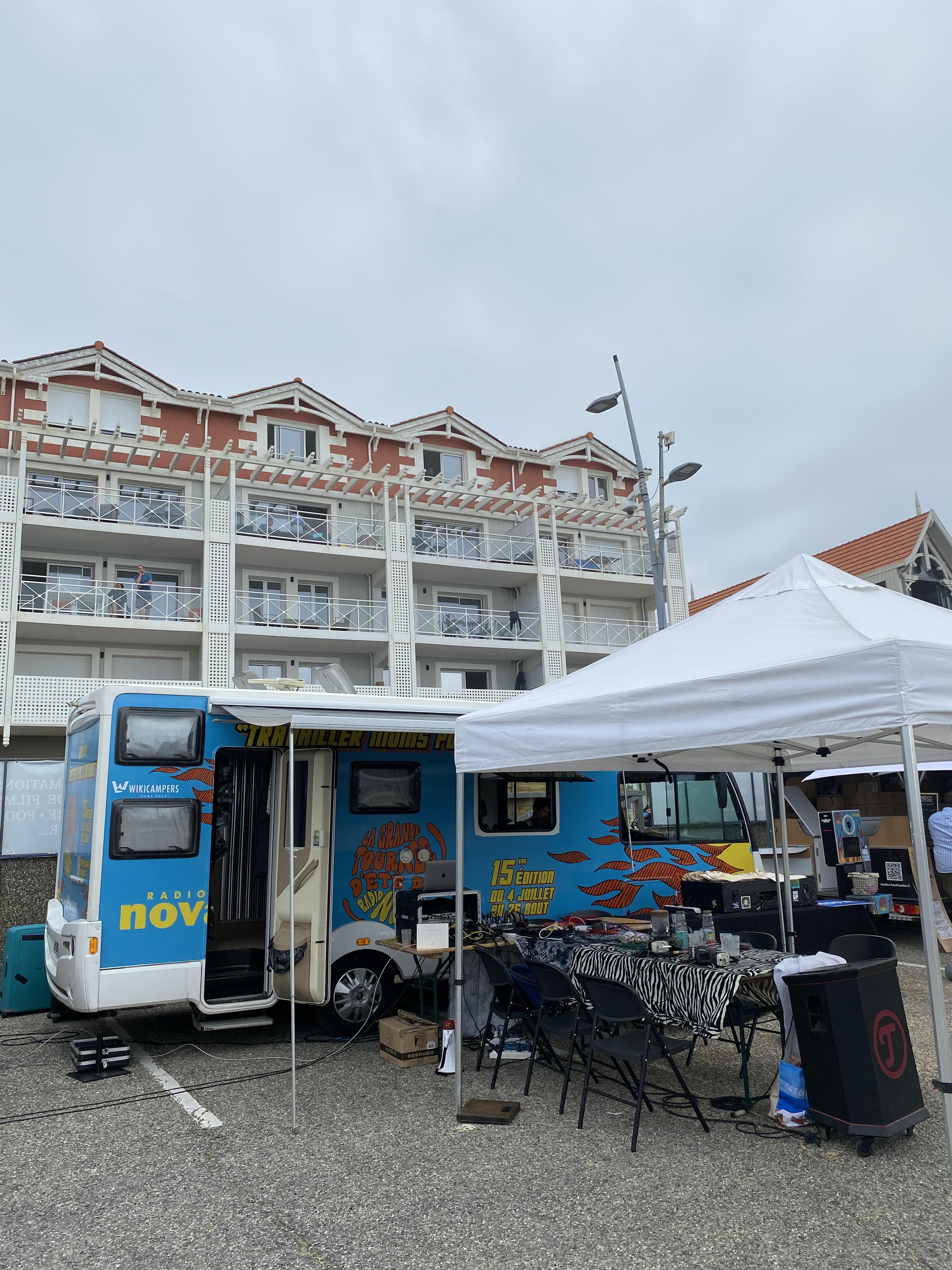 Le camping-car enflammé de Radio Nova se pose sur la Plage Centrale de Lacanau Océan.