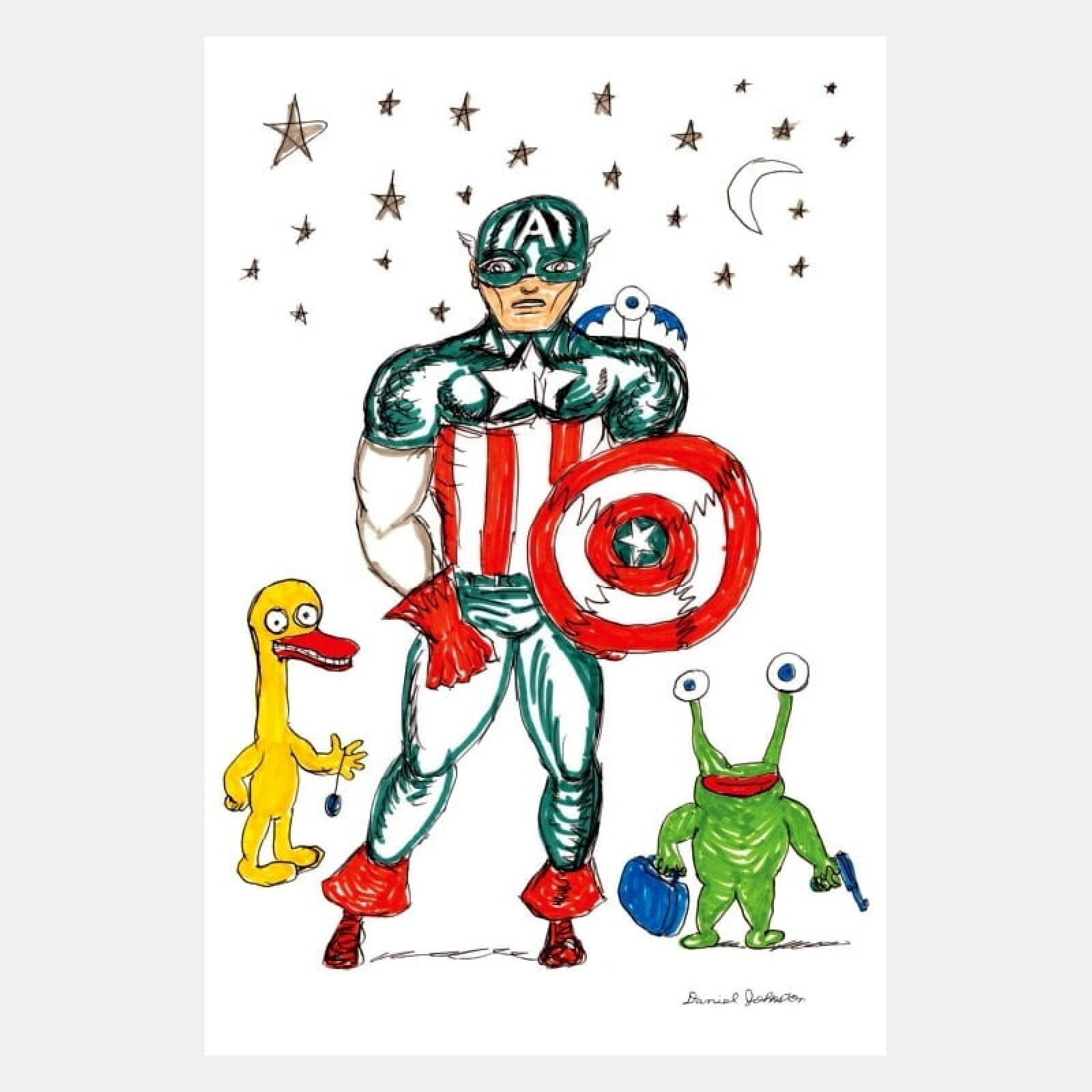 Admiré par Kurt Cobain, Sonic Youth, Larry Clark, David Bowie ou encore Matt Groening pour ses incroyables mélodies et son sens de l’interprétation – certes rudimentaire – mais à la désarmante sincérité, le regretté Daniel Johnston était également un prolifique artiste graphique. Sa production compulsive – proche de l’art brut – met en scène les héros de son enfance (Captain America, Hulk, Casper le fantôme … ) dans une lutte sans pitié contre les forces du Mal. Ils sont secondés dans cette tâche par Jeremiah la grenouille, les Space Ducks et des dizaines d’improbables personnages issus de son imagination sans filtre.