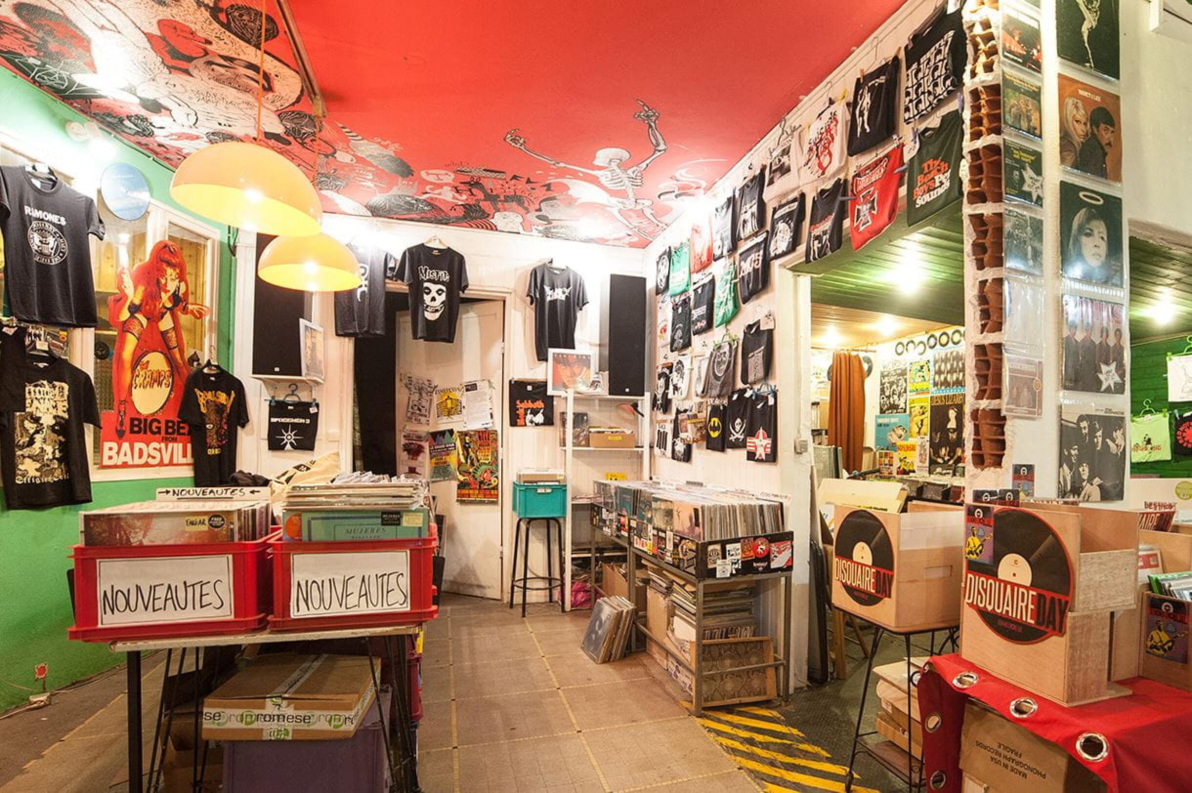 Traversez la façade bleue, récemment rafraichie par le duo d’illustrateurs Royal Béton, et vous trouverez, derrière le comptoir, les deux propriétaires du lieu, également batteurs à leurs heures loin d’être perdues : Martial Solis, à l’enthousiasme inaltérable (surtout si vous lui parlez de Ween ou de Prince !) et l’imposant Xavier « Babouche » Randrianasolo.