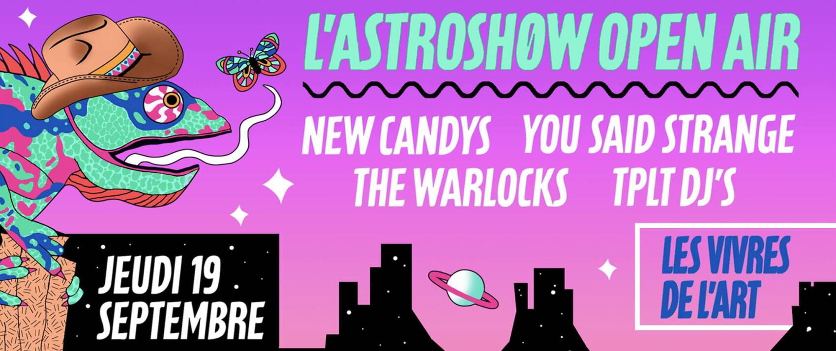 Avant de revenir à ses amours souterraines, planqué au milieu des coiffeurs et des enseignes de poulet-FC, L’Astroshøw s’offre une dernière soirée en extérieur du côté des Vivres de l’Art. Tout en veillant à appliquer à la lettre la locution anglo-saxonne : last but not least. Les petits plats sont dans les grands. Du psyché à tout va ! The Warlocks ! New Candys ! You Said Strange ! Les DJs du collectif tplt ! Et tout ça gratuit ! Oui, ça fait une avalanche de points d’exclamation, mais avouez que ça vaut le coup.