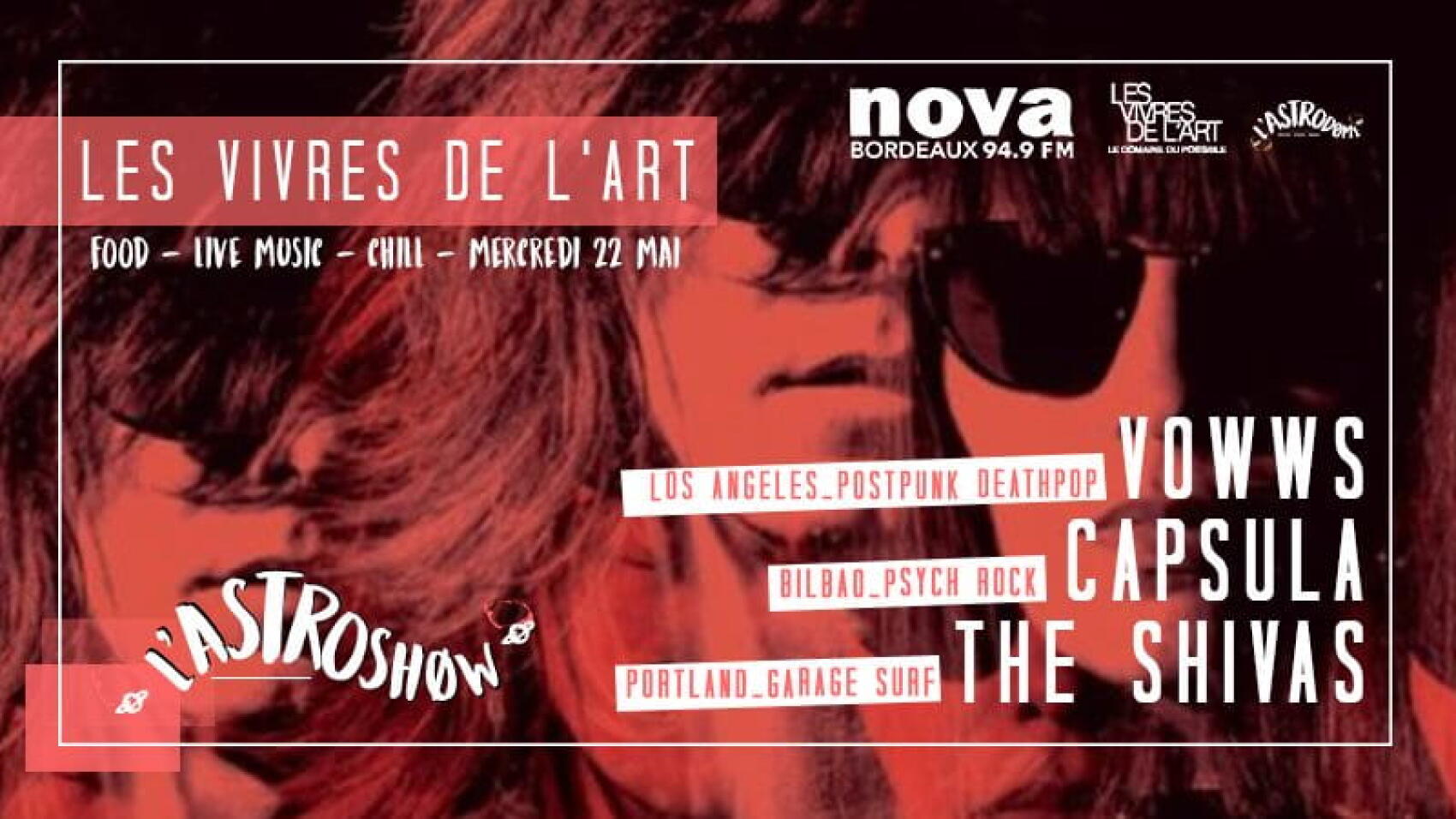 On avait l’habitude d’aller voir L’Astrodøme entre quatre murs bien épais, dans son antre secrète et souterraine de l’hypercentre bordelais. La belle saison pointant le bout de son museau, les bandits sûrs du psyché ont des envies d’ailleurs. Et autant l’annoncer sans ambages, ce n’est pas un pistolet à eau à la main qu’ils vont s’aventurer hors de leur tanière, direction les Vivres de l’Art. Au programme, un tapis de bombes fuzz larguées par une triplette qualité or : dans l’ordre d’apparition, The Shivas, Capsula et Vowws.