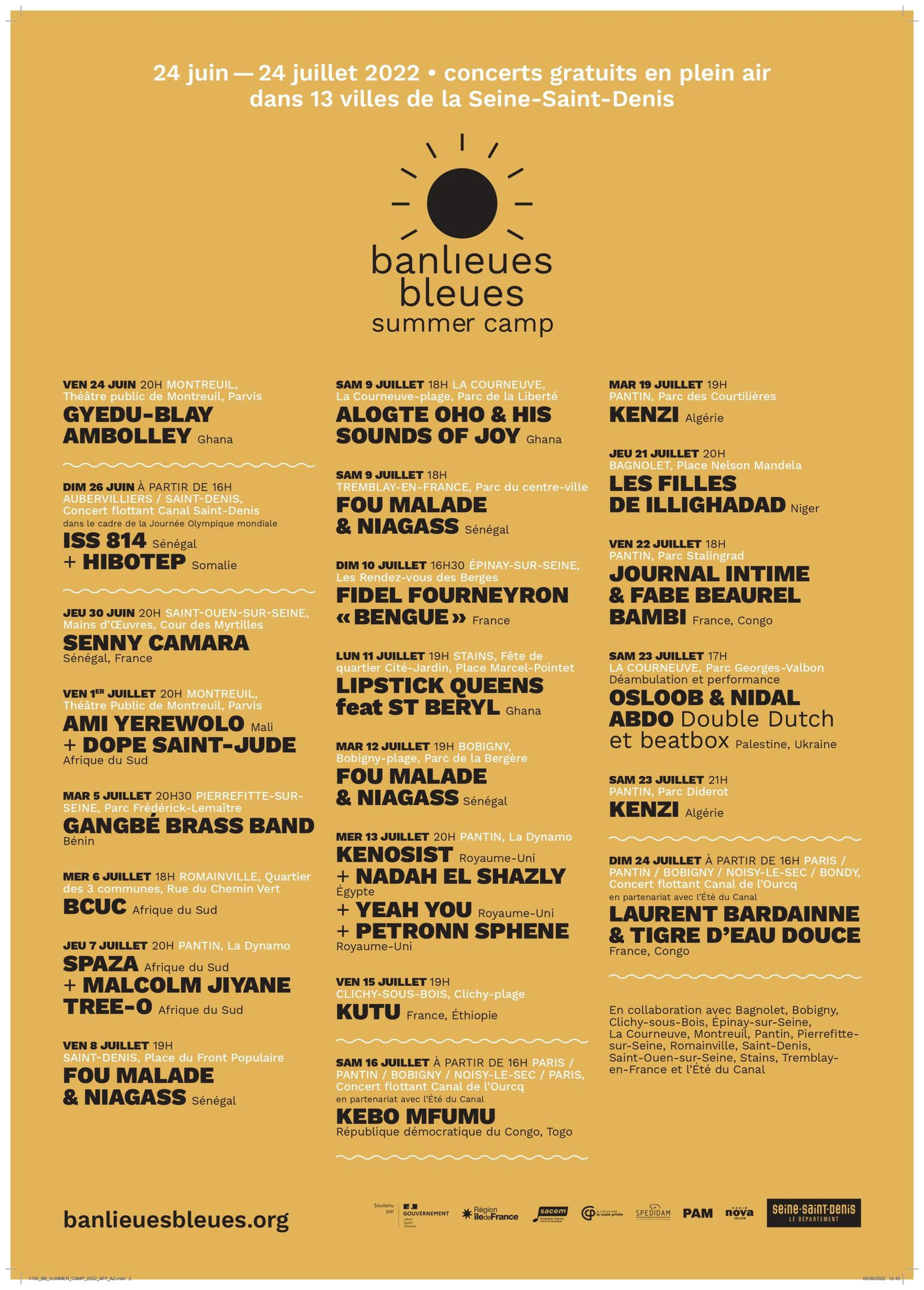 Pour sa deuxième édition, le meilleur camp d’été parisien revient poser sa tente dans treize villes de la Seine-Saint-Denis. De Montreuil à Aubervilliers en passant par Romainville et Saint-Denis, tout le monde se met au bleu et vous propose une programmation dans la lignée des habituelles Banlieues Bleues.