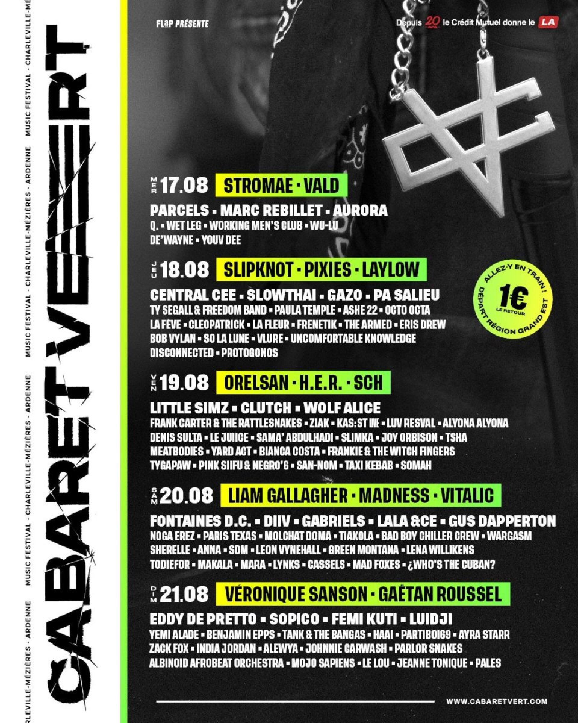 Vous pourrez donc retrouver entre autre Slipknot (oui), Parcels, Stromae, SCH, Laylow, Orelsan, Liam Gallagher, H.E.R, Pixies, Octo Octa, Vitalic, Partiboi69, Eris Drew, Marc Rebillet, Central Cee ou encore Aurora et Taxi Kebab et beaucouuuuuup d’autres.