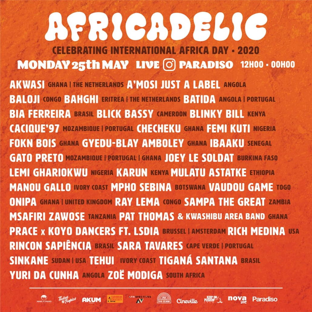 Troisième manifestation et non des moindres, c’est Africadelic, un festival annuel organisé au Paradiso d’Amsterdam avec le producteur et activiste culturel angolais Otiniel Silva, dit Mano. En résumé, c’est une grande partie de la playlist de Nova qui s’expose, tant les artistes font partie de cette jeune génération que nous soutenons. Le festival est virtuel et se développe en live sur la page Instagram du Paradiso, de 12h à minuit. La programmation inclut films, rencontres et des concerts de Blick Bassy, Femi Kuti, Pat Thomas, Sampa the Great, Fokn Bois, Baloji, Akwasi… Par ailleurs, le festival panafricain Africadelic rend hommage à Manu Dibango.