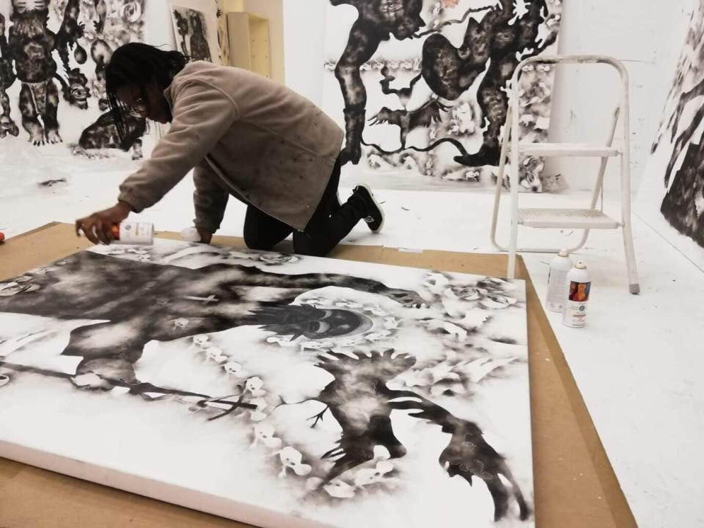 Aujourd’hui, cette peintre née et basée en République Démocratique du Congo utilise le feu, à l’origine de blessures et de terreurs enfantines, comme catharsis pour créer un art introspectif. Comme le met en scène le film de Renaud Barret, Système K (actuellement en salles), Géraldine Tobé fait partie de la bouillonnante scène artistique de Kinshasa et peint avec le noir de fumée. Elle applique de vieilles lampes à huile contre une toile blanche avant de creuser, taillader, délimiter la trace du dioxyde de carbone ; pour lui donner des formes de corps sombres, désarticulés. Ces silhouettes trahissent ses traumatismes personnels et ceux de tout un peuple qui, entre instabilité politique et extrême pauvreté, peine encore à trouver un équilibre.