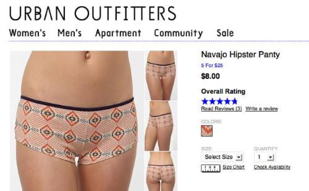 James Anaya, l’un des avocats défendant la proposition de loi présentée à l’ONU fait notamment référence à la collection « Navajo » de la marque américaine Urban Outfitters. En utilisant le nom de la nation Navajo et ses attributs culturels, sans spécifier que le produit en question n’a aucun rapport avec eux, Urban Outfitters utilise la culture Navajo (dont le nom est déposé) pour vendre un produit. Un scandale, quand on connaît le contexte économique dans lequel vivent ces populations. Sans parler, bien entendu, du génocide qu’elles ont subi.
