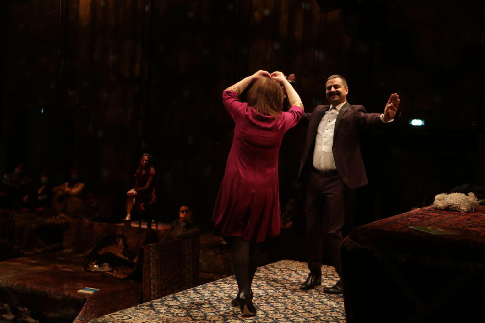 Rassemblées sur la même scène, dans une scénographie inspirée par les restaurants et les chây-khooneh de Darband, au nord de Téhéran (où les client.es mangent à ciel ouvert, assis.es sur des chevalets-lits recouverts de tapis posés sur des rus peu profonds), la mère et les tantes de l’auteur s’invitent à ses côtés pour raconter, se raconter, tout autant au présent que dans les bribes de leurs passés, leurs soliloques vibrant avec les compositions électroacoustiques de Lucien Gaudion, émaillées de chansons populaires iraniennes.