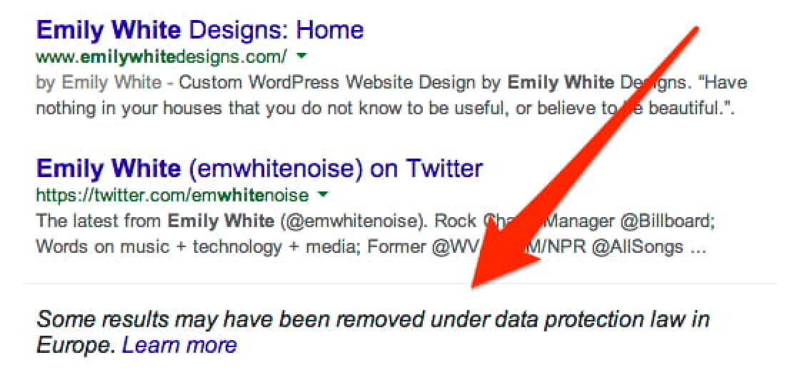 Surfant sur cette opportunité et en guise de solution Google a donc décidé de stipuler un message qui prévient du fait qu’un utilisateur a demandé la suppression d’un résultat, ou choisit même d’afficher en permanence un message qui affirme que la loi interdit la diffusion d’informations… Le but, faire appel à une réclamation de transparence toujours plus forte des utilisateurs… bref… Compliqué de faire les malins avec Google.