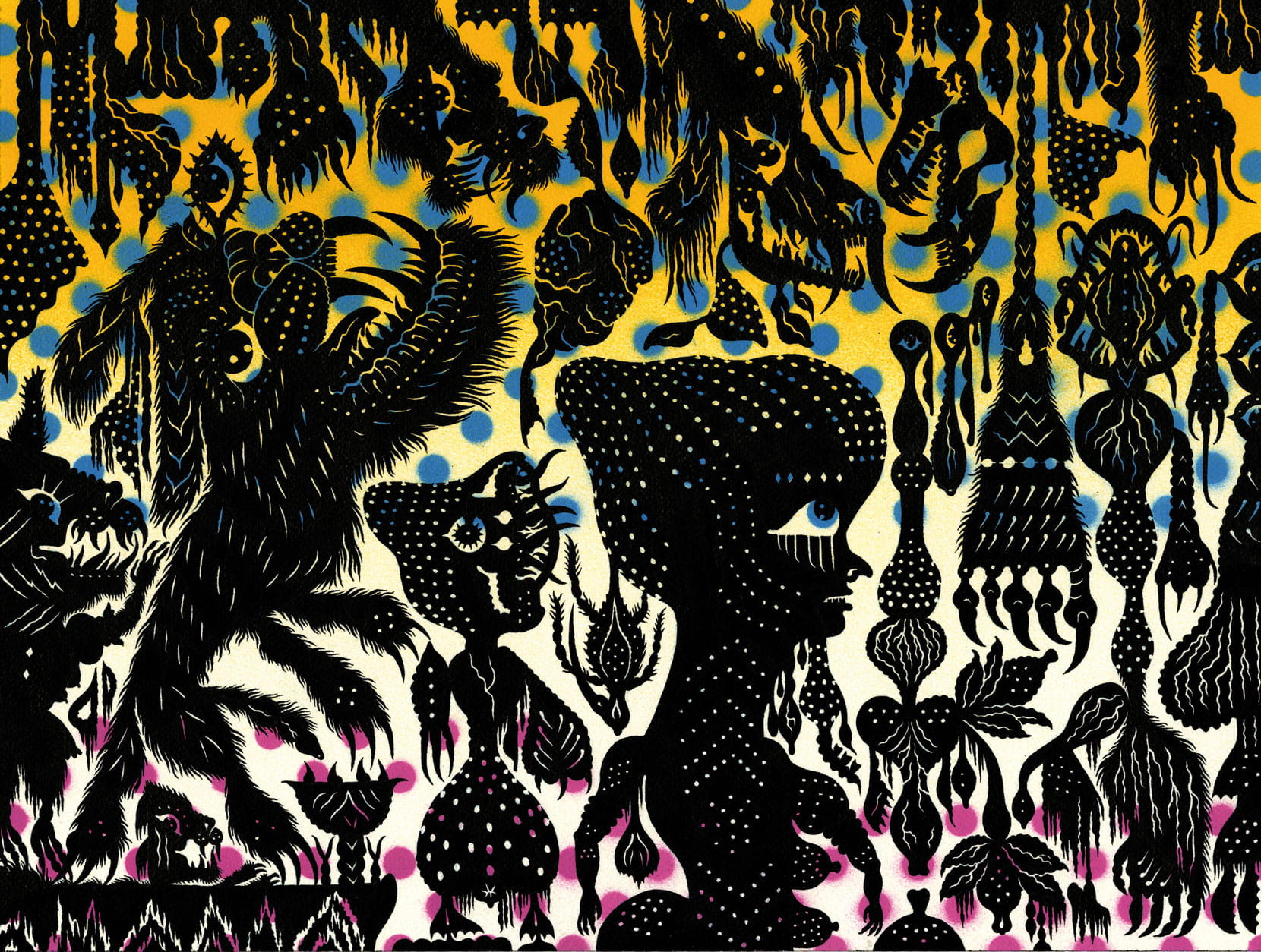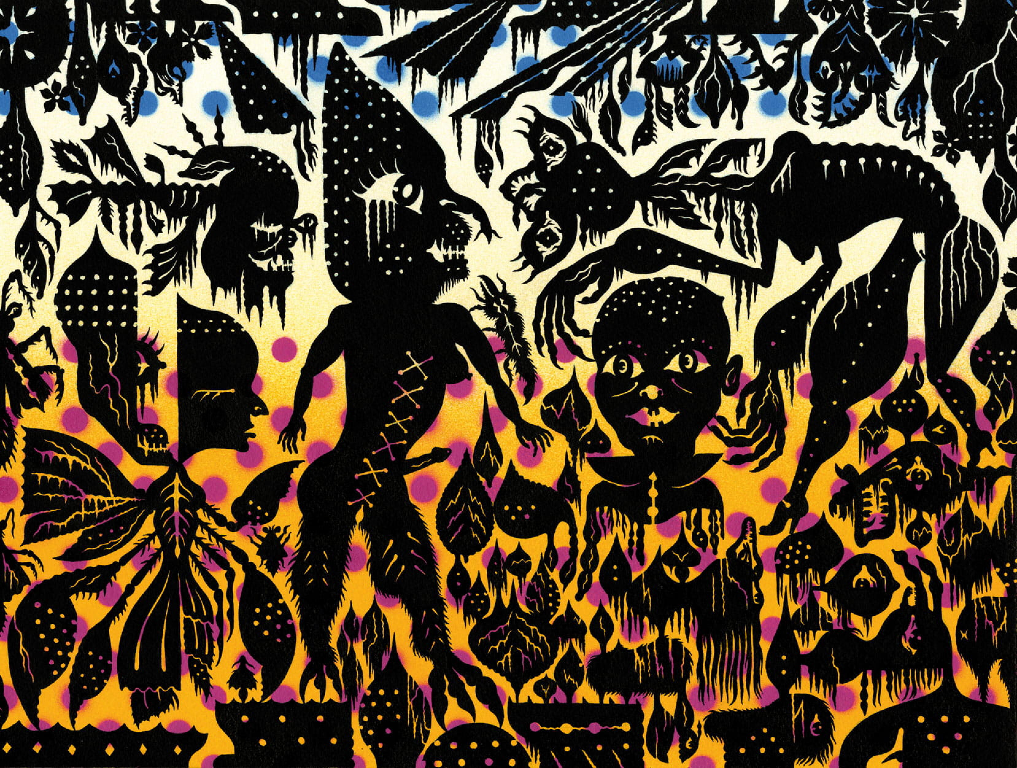 Le découpage infini des formes, la finesse des détails rappellent aussi les sarongs indonésiens et les motifs de la cité interdite… L’abondance d’êtres étranges et de démons maléfiques, mi-dieux , mi-bêtes, fait écho aux Tangkas du Tibet.