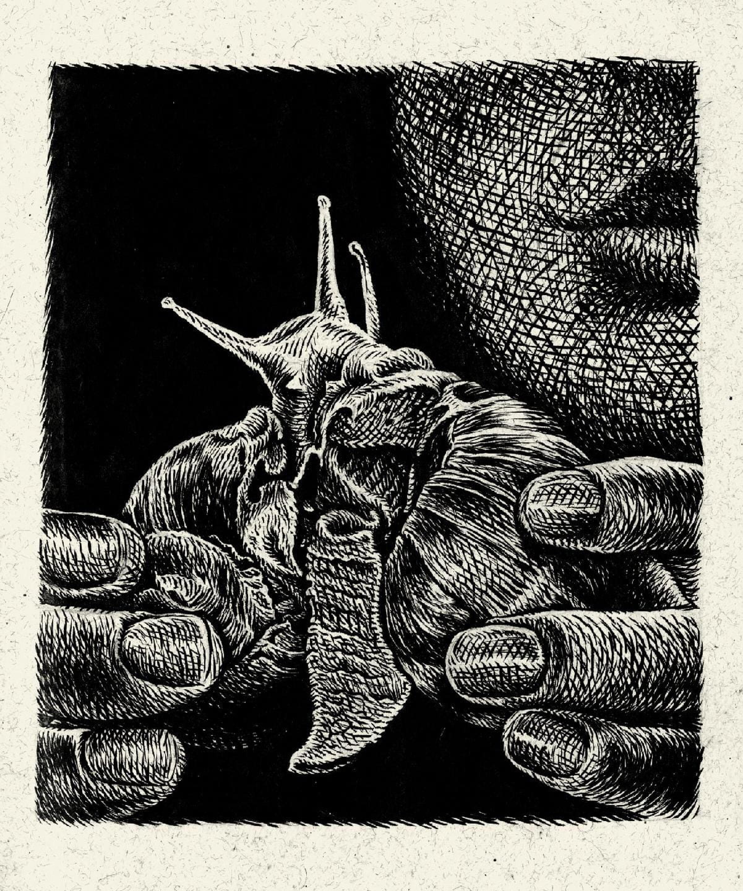 Une autre partie de son travail est faite de hachures : dessins réalistes à la plume, faits de croisillons dans la grande tradition de la gravure. Lui même vient d’un background « underground », de contes et légendes noires, pleins de viscères, de plantes, de poils et de reflets, surpeuplés d’êtres étranges opposés aux canons classiques.
