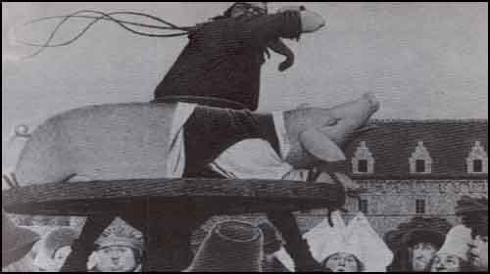 En 1386 par exemple, on condamne une truie à être mutilée au groin et aux pattes avant d’être pendue parce qu’elle avait croquer le visage et un bras à un gosse, mort peu après. Pour la pendaison, on lui met un élégant masque de visage humain et on la déguise en homme. Pousser le talion, la « justice », le ridicule, jusqu’au bout.