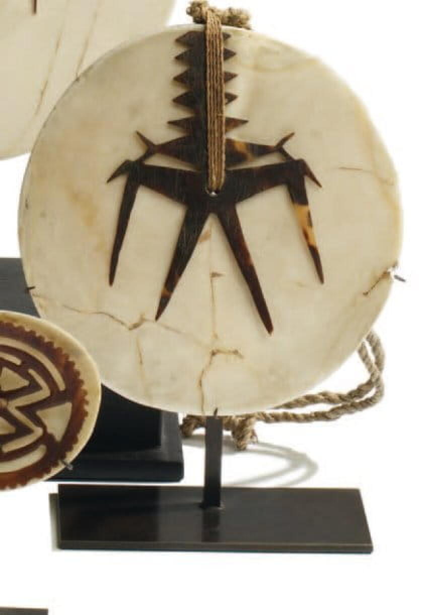 A ces trésors s’ajoutent de superbes PARURES DE POITRINE OU DE FRONT. Des DISQUES DE NACRE gravés de lignes géométriques, taillés dan d’énormes coquillages… De vrais soleil sur les poitrines des chefs Salomons . (en plus de bracelets, colliers et tatouages)
