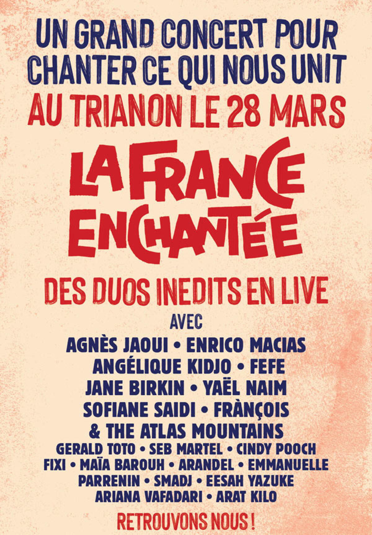 « Pour chanter ce qui nous unit … », un grand concert avec des rencontres musicales inattendues, des chansons françaises interprétées par des duos d’artistes. Bintou échange avec la journaliste Élodie Maillot qui a entrepris de produire un grande soirée rassemblant musiciens, chanteurs et chanteuses qui vont former des duos inédits (Frànçois and The Atlas Mountains et Cindy Pooch, Arandel et Emmanuelle Parrenin, etc.) et interpréter des morceaux qu’ils portent au fond du cœur.