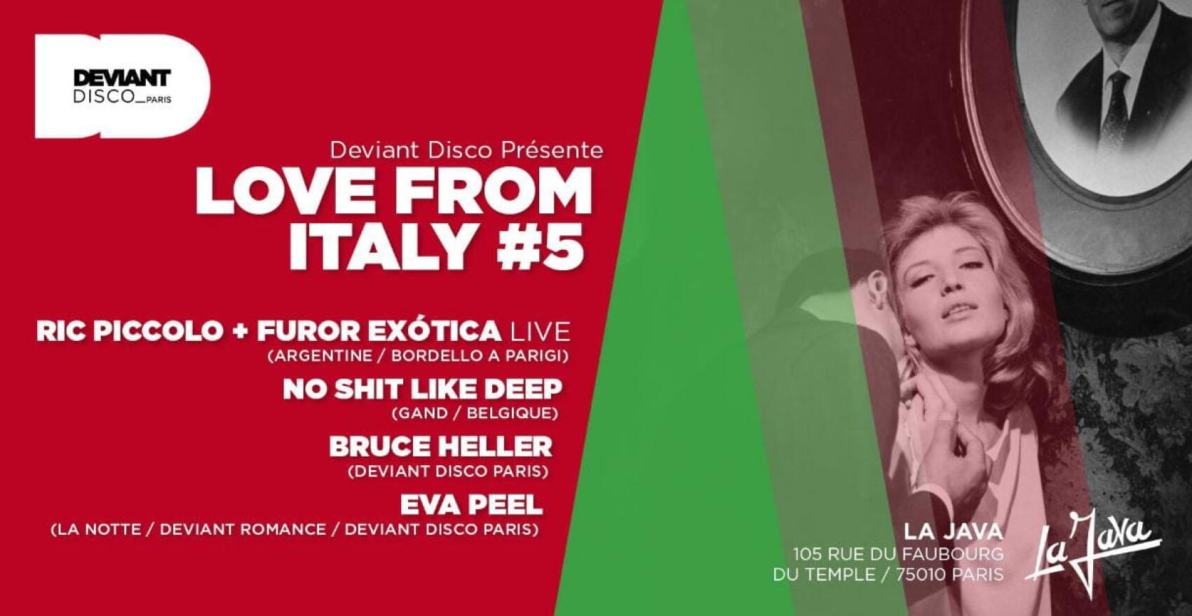 Deviant Disco présente Love from Italy #5 w/ Ric Piccolo & No Shit Like Deep | Le vendredi 20 septembre de 00:00 à 06:00 | La Java, 105 Rue du Faubourg du Temple, 75010 Paris | Ici la billetterie | Ici l’événement