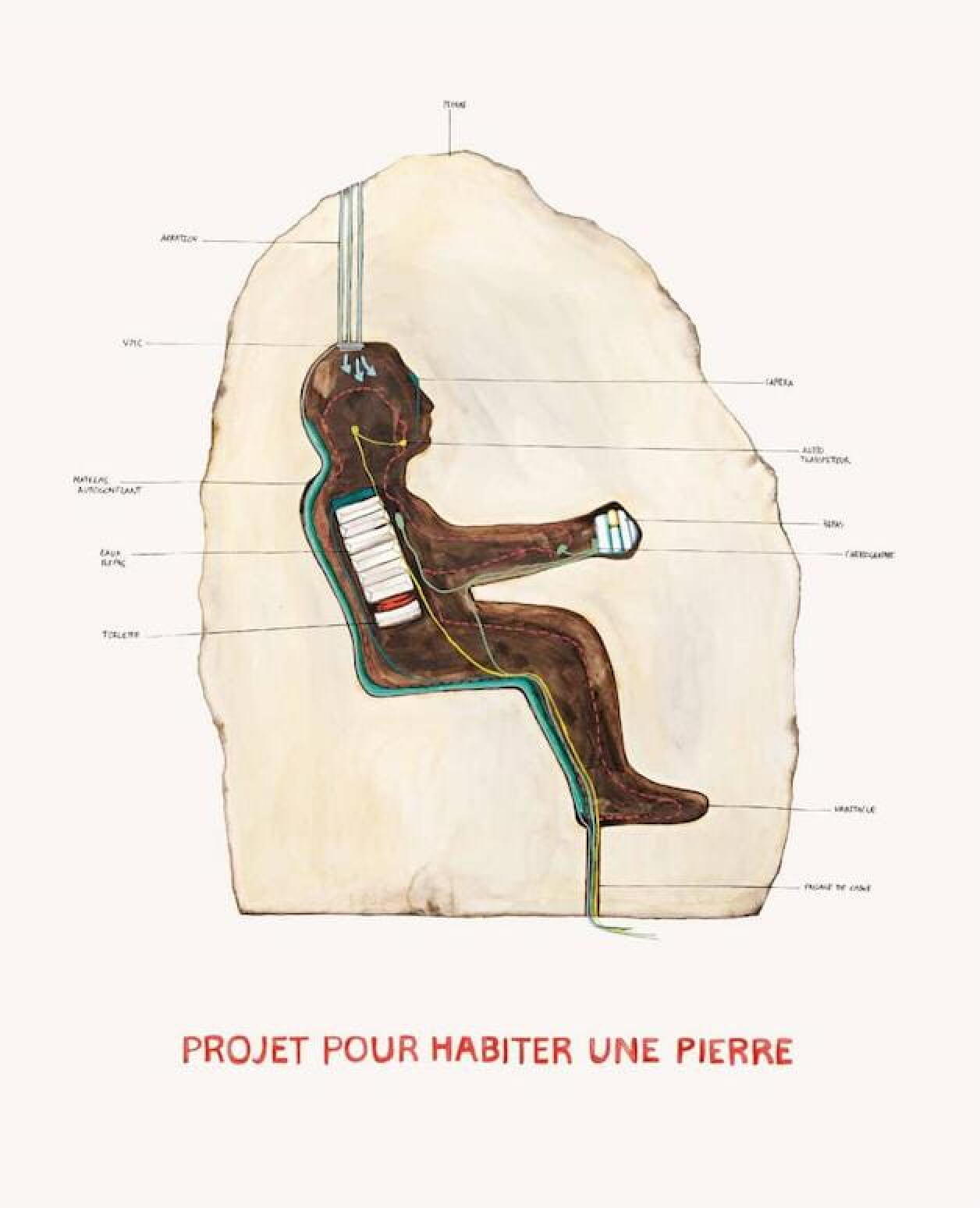 Bref, Abraham Poincheval aime l’enfermement, le défi physique et mental et les aventures impossibles, ce qui provoque chez les autres toutes sortes de sentiments pas toujours bienveillants. Marie Transport est allée le rejoindre dans le quartier de sa galerie, où ils ont pris un café après s’être entrechoqué la tête en guise de bonjour, ils ont ensuite pris un bus mais voyant que ça mettait Abraham un peu mal à l’aise, ont préféré sortir, marcher dans la rue et trouver un tunnel en béton de quasiment 1km, un lieu qu’il a immédiatement adopté. Bientôt Abraham Poincheval marchera sur les nuages.