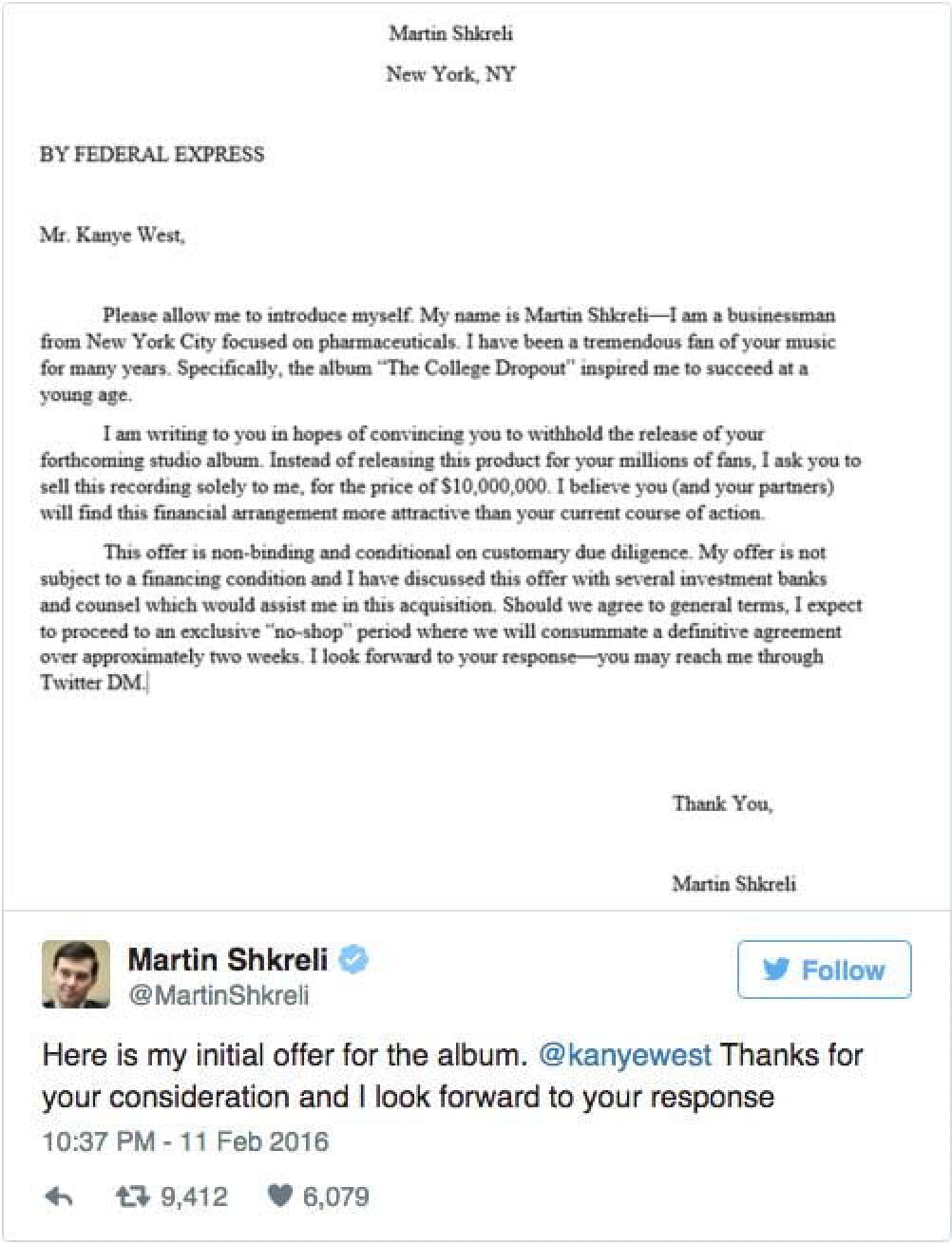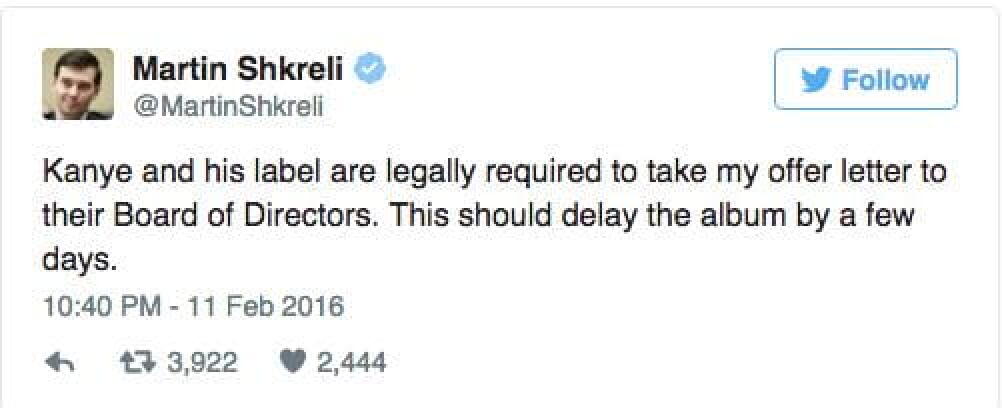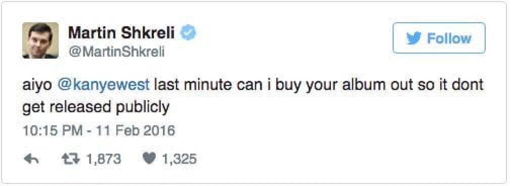 A force de connerie, l’homme est devenu récurrent dans l’actualité musicale ces dernières semaines. Martin Shkreli est l’ordure qu’on ne présente plus, patron pharmaceutique véreux et féru de rap, il est le propriétaire de l’album unique du Wu Tang Clan, Once Upon A Time in Shaolin. Récemment, il a été à l’origine d’un beef avec Ghostface Killah, en vidéo s’il vous plaît où il menace d’effacer les couplet du rappeur du vinyle. Hyper impressionnant.