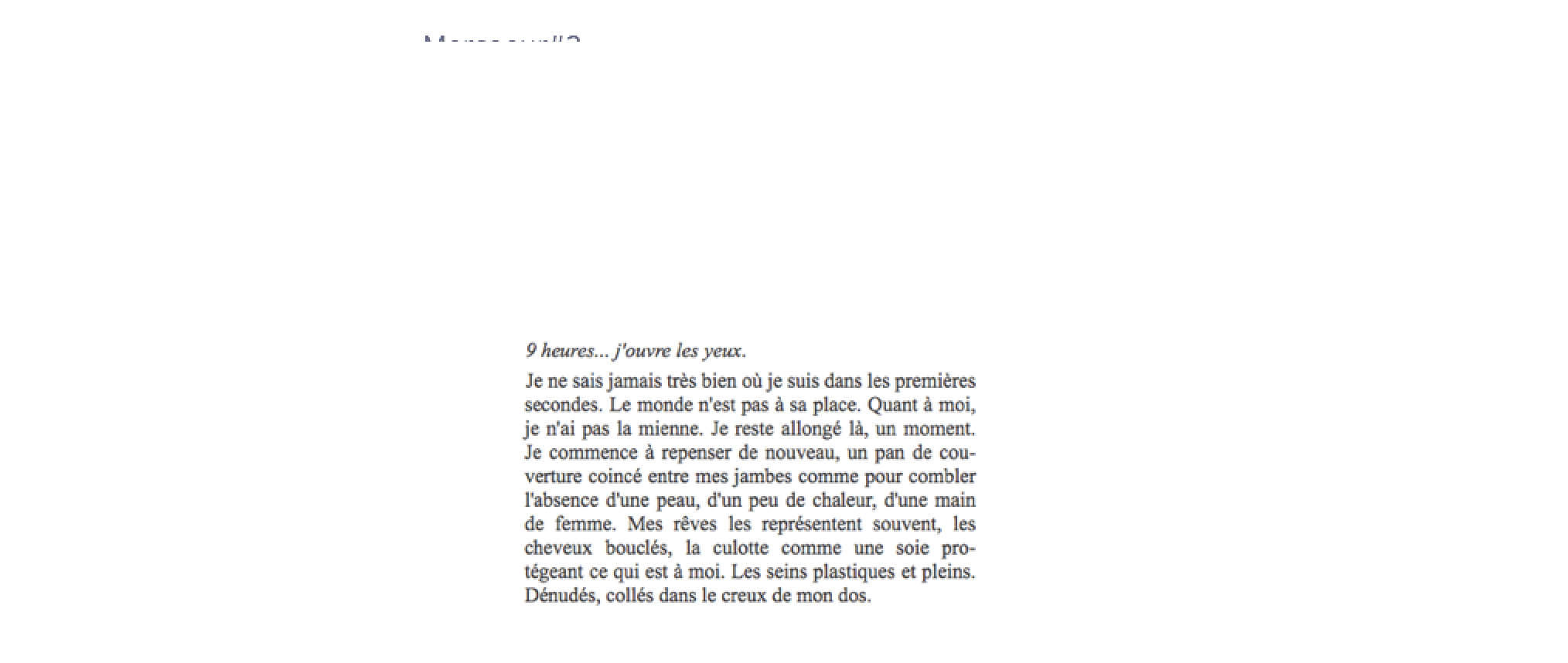 Pas de ressentiment envers la lecture traditionnelle dans cette nouvelle forme de littérature numérique, et au contraire : ce Mercoeur est presque nostalgique du papier, réintégrant ses codes visuels à nos écrans, s’attachant à l’objet-livre dans ses premiers chapitres.