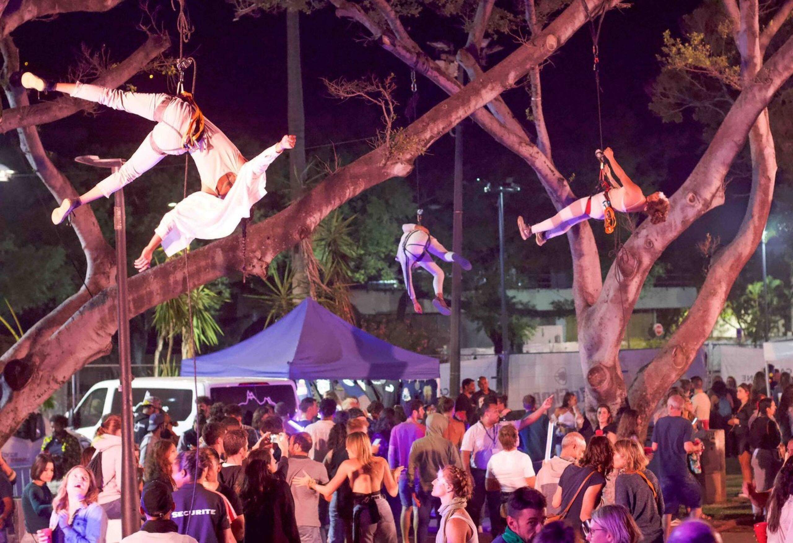 Pendant son mixe et durant toute la durée du festival, la compagnie circassienne Cirquons Flex développe une pratique hybride entre cirque et danses traditionnelles de l’île. Certains jouent à Anakin Skywalker avec des bâtons enflammés (sur le toit de la scène alternative, c’est très impressionnant), d’autres jonglent sur des échasses (sacré équilibre) ou se suspendent aux arbres, la tête en arrière et le corps dans les airs. Ils sont pendus, mais ne sont pas morts : au contraire, ils vivent intensément. Les circassiens font des ronds autour du bassin central qui limite les deux scènes du festival, le public les imitera bientôt — en légèrement moins gracieux. Dans le bassin, les plus dissipés y piquent une tête. La sécu râle. Rien ne dégénère. Tout va bien.